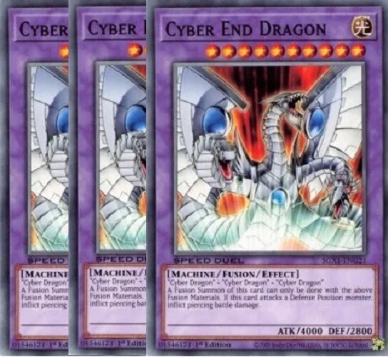Cyber End Dragon x 3 1st Edition You will received 3 cards are they are in NM condition. Also will include a free Holographic card which can be a rarity of Super, Ultra, Secret, etc! Card Information "Cyber Dragon" + "Cyber Dragon" + "Cyber Dragon" A Fusion Summon of this card can only be conducted with the above Fusion Material Monsters. During battle between this card and a Defense Position monster whose DEF is lower than the ATK of this card, inflict the difference as Battle Damage to your opponent's Life Points." Number: SGX1-ENG21 Rarity: Common