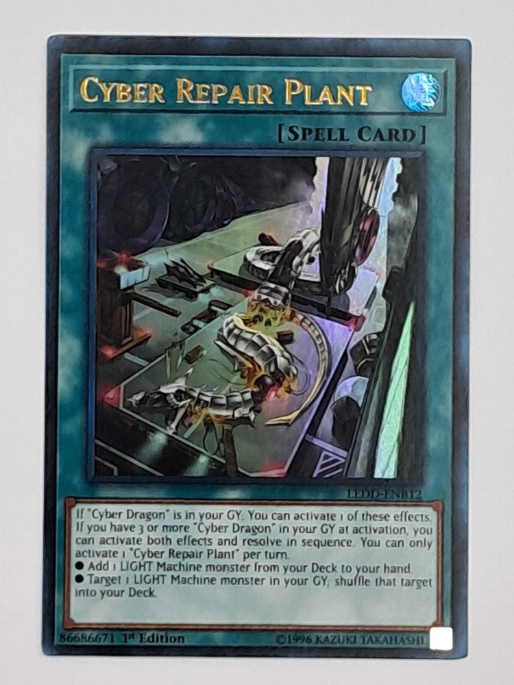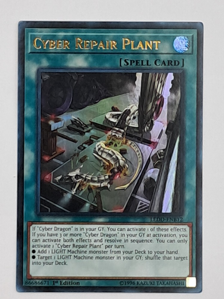 Yugioh Cyber Repair Plant LEDD-ENB12 Ultra Rare 1st Edition from Legendary Dragon Decks Condition : Very Light Play ( VLP ) Near Mint card in excellent condition, has a very light scratch and no signs of wear. Perfect for both display and gameplay. If you have any questions or need additional pictures, feel free to reach out! I’m here to help!