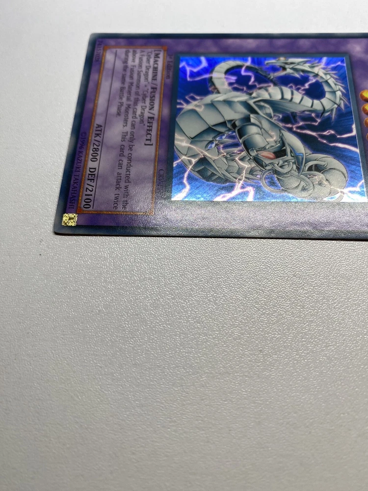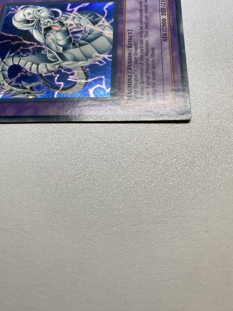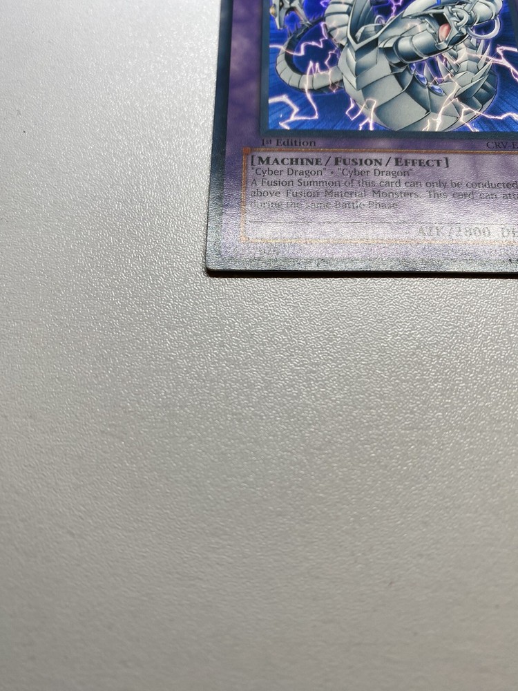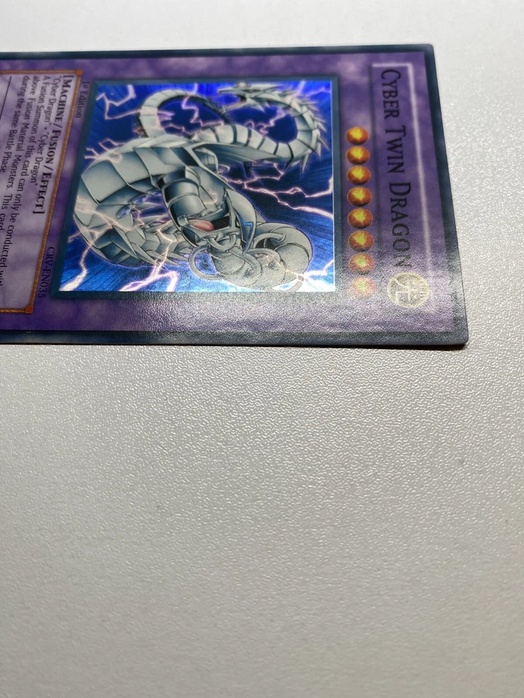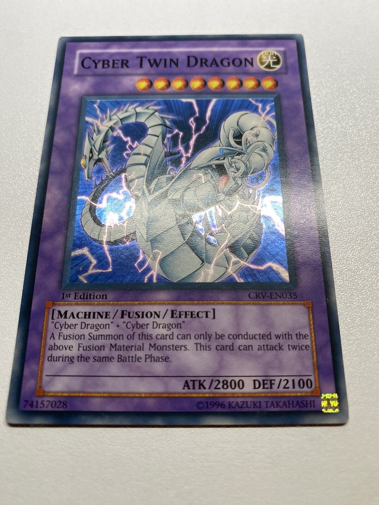 Yugioh Cyber Twin Dragon 1st Edition Super Rare CRV-EN035 HP It is heavily played. Check pictures to see details on condition of the card. The front and back of the card are very dirty from gameplay. The front and the back are very scratched from gameplay. The four corners are very scratched up. There are several dents on the front and back of the card. All around the edges are scratched up. “eBay International Shipping Program” and USA shipping only. No international shipping. I do combine/bundle shipping. I do use recycled shipping items to stay eco friendly for our beautiful earth. Please leave positive feedback, and I will return positive feedback for better customer satisfaction, thanks.