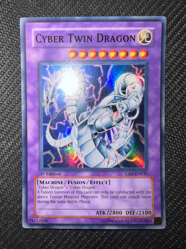 Description: You are purchasing Yugioh Cyber Twin Dragon 1st Edition Super Rare CRV-EN035 LP/NM (B). Condition: Used, lightly play to near mint. Please review photos before buying/bidding. Card comes as shown. Payment: Payment is expected within 3 days of your purchase date. We accept all forms of payments. All sales are final, no exceptions. Shipping and Handling: Buyer pays shipping. Card will be shipped via eBay standard mail within 3 business days from date of purchase that includes tracking. The card will be sent in a card sleeve and plastic top loader.