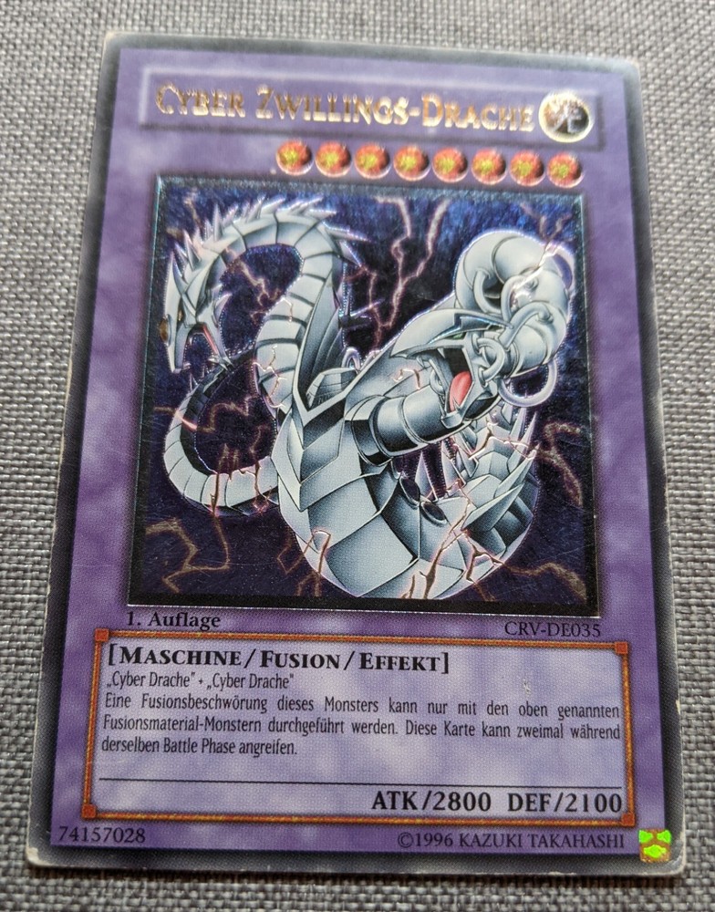 ENGLISH Hello, You are bidding on 1x Yu-Gi-Oh! Cyber Twin Dragon GERMAN Ultimate Rare first edition CRV-EN035 ("Cyber Zwillings-Drache" CRV-DE035) from the set Cybernetic Revolution. Please see the pictures attached for the actual conditions. Here you can find a video of the card. High resolution scans are available, please contact me to receive them. All cards are originals, no proxies or fakes. You can see here how do we test them to assure their authenticity. Methods of payment: Paypal, Bank transfer, direct payment with credit card. Shipping: Shipping will be 5,99€ for registered mail in Europe and 9,99€ Worldwide. Cards worth over 100€ will be sent only with Insured Mail in Europe (6€+1€ every 50€ insured) or FedEx - UPS Worldwide. International Buyers (outside European Union) - Please Note: Import duties, taxes, and charges are not included in the item price or shipping cost. These charges are the buyer's responsibility. Please check with your country's customs office to determine what these additional costs will be prior to bidding or buying. ITALIAN Salve a tutti, questa é un'asta per 1x Yu Gi Oh! Cyber Twin Dragon in Tedesco Ultimate Rare First Edition. In alegato troverete le scansioni delle carte in vendita. Sono disponibili altre immagini ad altissima risoluzione, contattateci per riceverle. Spese di spedizione: 5,99€ per Posta Raccomandata in qualunque paese europeo. Normalmente facciamo una spedizione alla settimana, se avete urgenza di ricevere la carta per favore contattateci prima dell'acquisto. Metodi di pagamento: Si accettano tutti i metodi di pagamento tranne il Contrassegno. Condizioni e termini dell'asta: Il pagamento va effettuato entro e non oltre 7 giorni dal termine dell'asta, trascorsi i quali la transazione verrà considerata nulla, l'oggetto sarà rimesso in vendita e verrà inviata una notifica di Offerente Non Pagante tramite Ebay. DEUTSCH Hallo,Ihr bietet in dieser Auktion auf 1x Yu-Gi-Oh! Cyber Zwillings-Drache CRV-DE035 Deutsch Alle Karten sind original und Turnierlegal, kein Goldrand oder Silberrand, kein International oder Collectors Edition und werden getestet. Den Zustand der Karte / Karten entnehmen Sie bitte dem beigefügten Foto (die Bilder sind Originalscans). Zahlungsart: PayPal. Versandkosten: EU 5,99€, Übersee: 9,99€. Einschreiben versichert mit Sendungsnummer. Kostenlos Kombiversand beim Kauf mehrerer Artikel machbar. Es handelt sich bei der Auktion um einen Privatverkauf. Ich weise ausdrücklich darauf hin, dass ich bei Warenverlust keine Haftung übernehme und weder eine Garantie noch eine Gewährleistung geben kann. Ein Umtausch und eine Rückgabe sind ebenfalls nicht möglich. Schauen Sie auch gerne meine anderen Auktionen an.