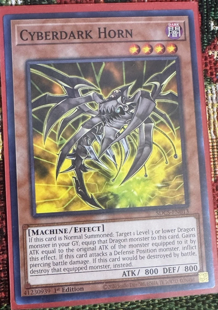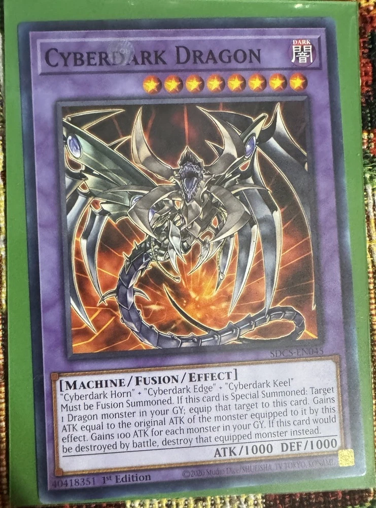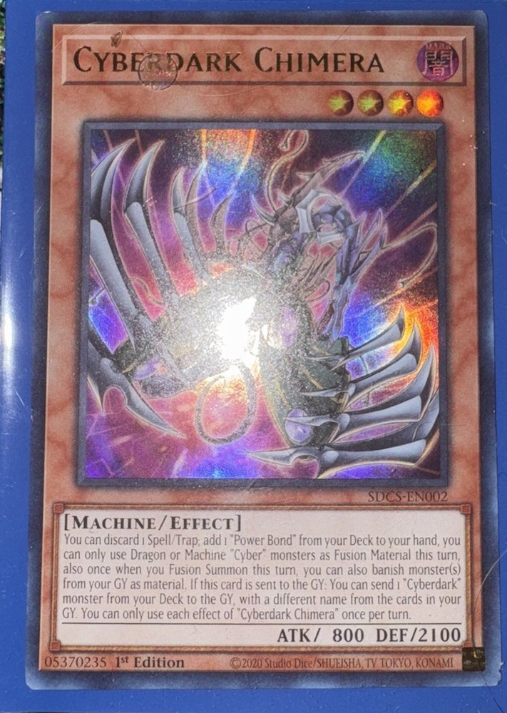 Elevate your Yu-Gi-Oh! TCG collection with the Cyberdark Realm, Chimera, and Fusion Development cards from the Structure Deck: Cyber Strike-Unlimited Edition. These Ultra Rare, English-language cards are a must-have for players and collectors alike, featuring the enigmatic Zane Truesdale and his spellcaster prowess. With card numbers SDCS-EN023, EN002, and EN030, this set is a significant addition to any deck or display. Crafted by Konami and released in 2021, these cards cater to enthusiasts aged 6 and older. They are designed to provide endless entertainment in the strategic gameplay of the Yu-Gi-Oh! TCG. Manufactured in the United States, this set of three cards is a testament to the enduring legacy and continuous evolution of the Yu-Gi-Oh! GX franchise. As an added bonus I’ll be adding 4 common cards, Cyberdark Keel (en015) Cyberdark Edge (en014) Cyberdark Horn (en013) Cyberdark Dragon (en045) All mint/near mind conditions, plus each cards will come with sleeves. I hope you can use any of these cards for your battle strategies or as an added collectors items. Keep the heart of the cards in you.