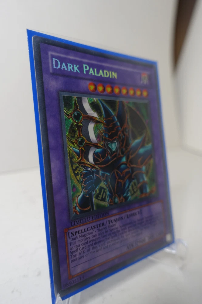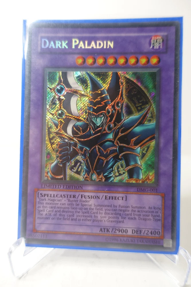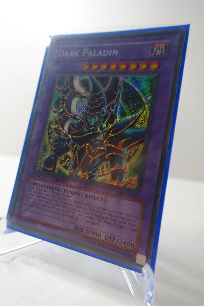 Yugioh Dark Paladin DMG-001 Secret Rare Limited Ed MP Game Promo.A largely unplayed Dark Paladin in exceptional condition. Kept well in sleeve and binder and handled with care. Grade worthy condition.