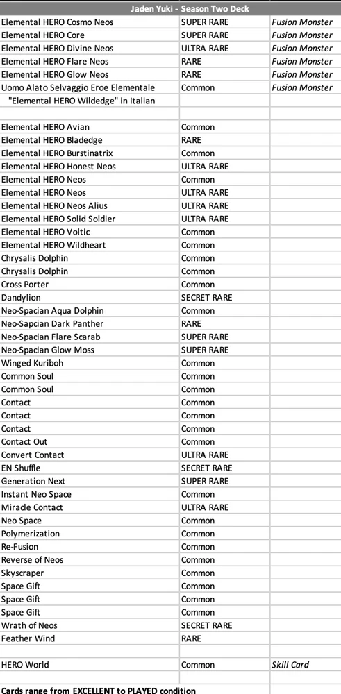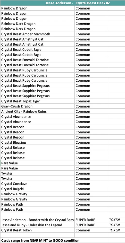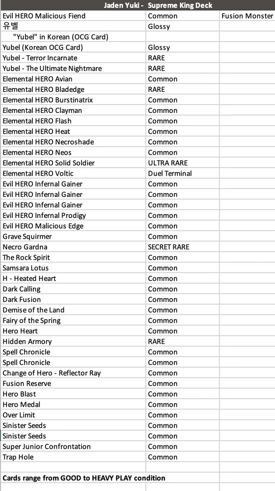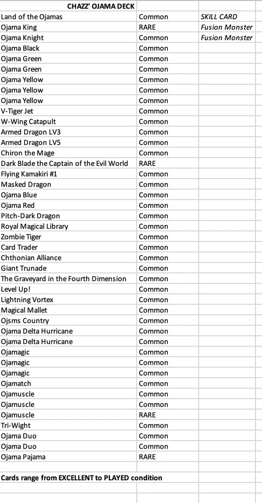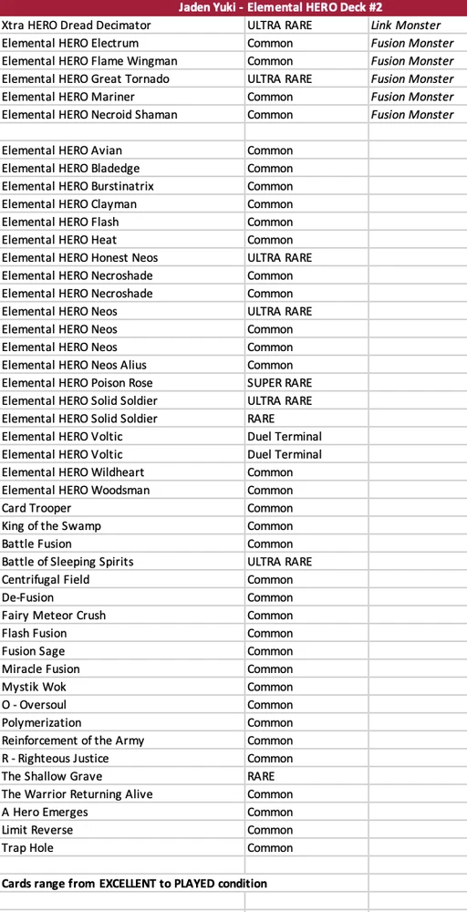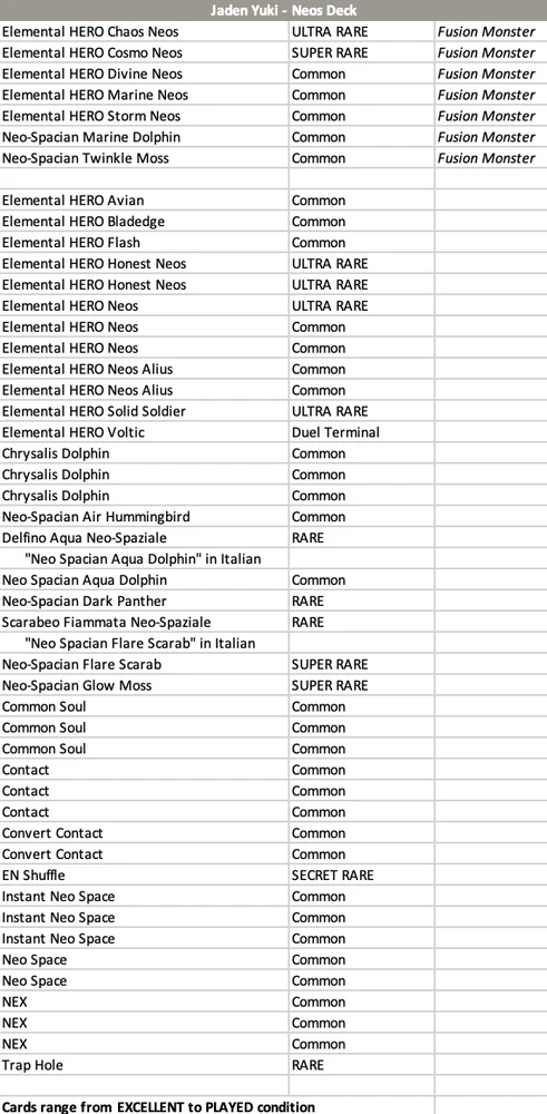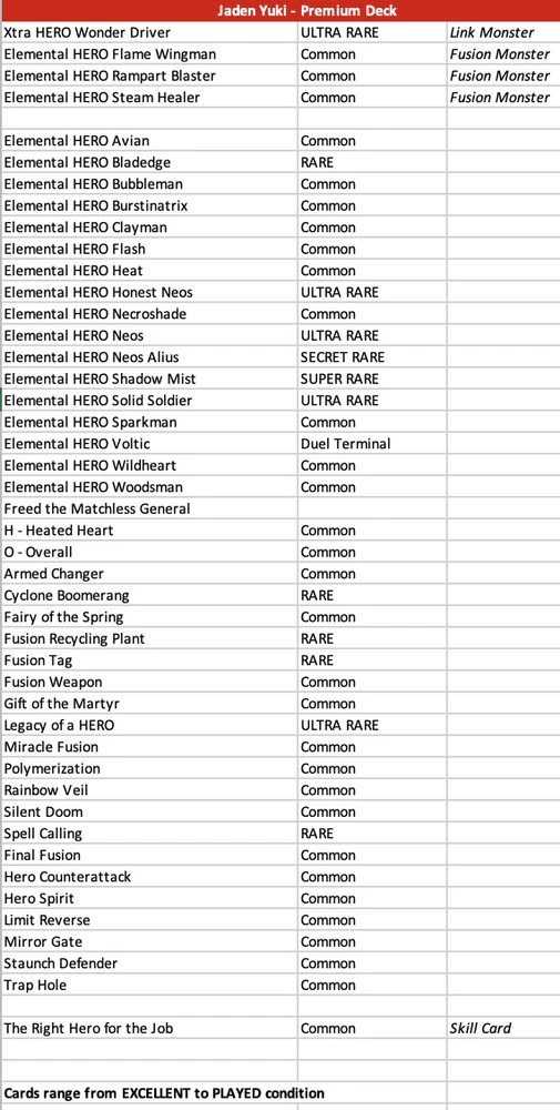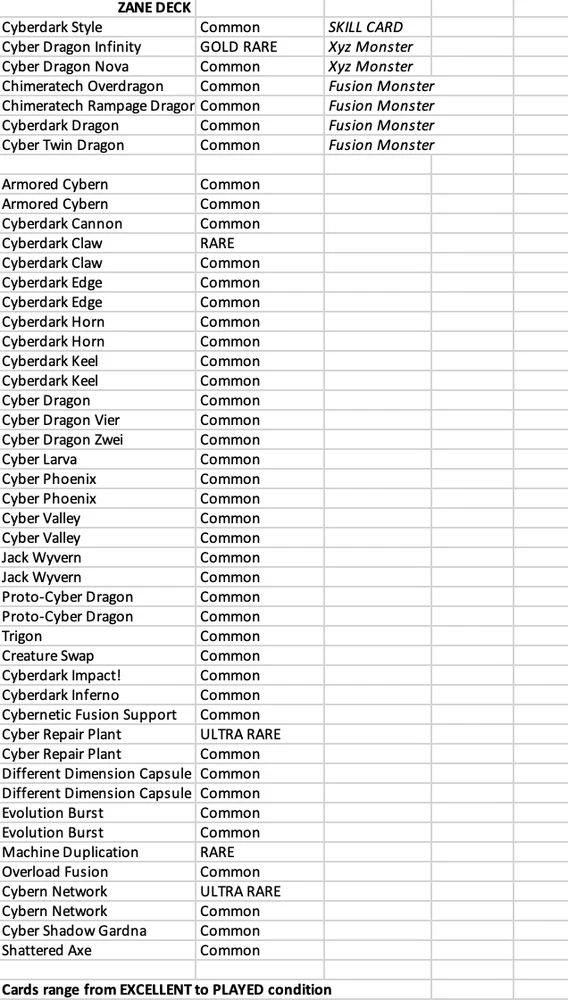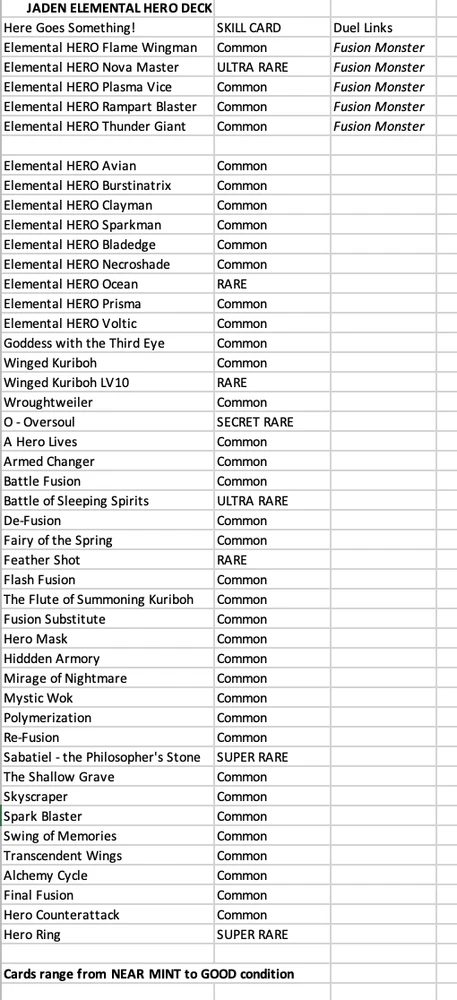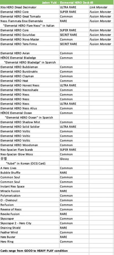 Character Decks from the Yu-Gi-Oh! GX Anime/Manga series ***New decks are currently being added. Check my store for more decks. ITEM HISTORY: These cards are all authentic Konami Yu-Gi-Oh! cards. I made the decks myself using cards from my collection. Please consult the card list in the photos to see the cards. These decks were not made to be competitive; they are based on decks that I build with friends for friendly, fun duels to play like the characters. SELLER HISTORY: I have been selling on eBay for many years now, specializing in Yu-Gi-Oh! cards. Because my daytime job can be demanding, I have decided to start selling nearly my entire collection. It may take me a while to get the listings up, so check back for new listings. SHIPPING: Decks will be shipped via USPS. Decks are packaged tightly to protect the cards and then shipped in a mailing envelope. You will have options to upgrade your shipping to Priority Mail for faster delivery. VOLUME PRICING: If you buy multiple listings from me during your checkout, you will significant discounts! Feel free to ask any questions you may have about the listings.