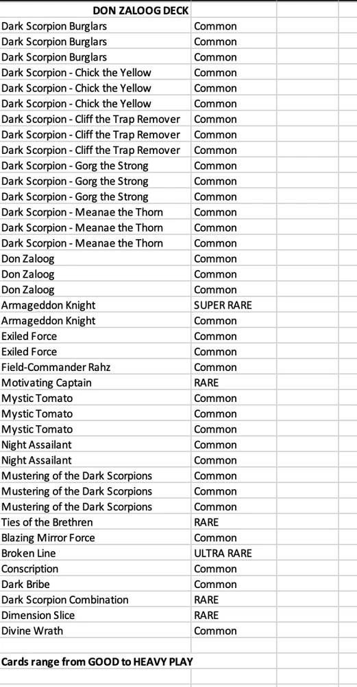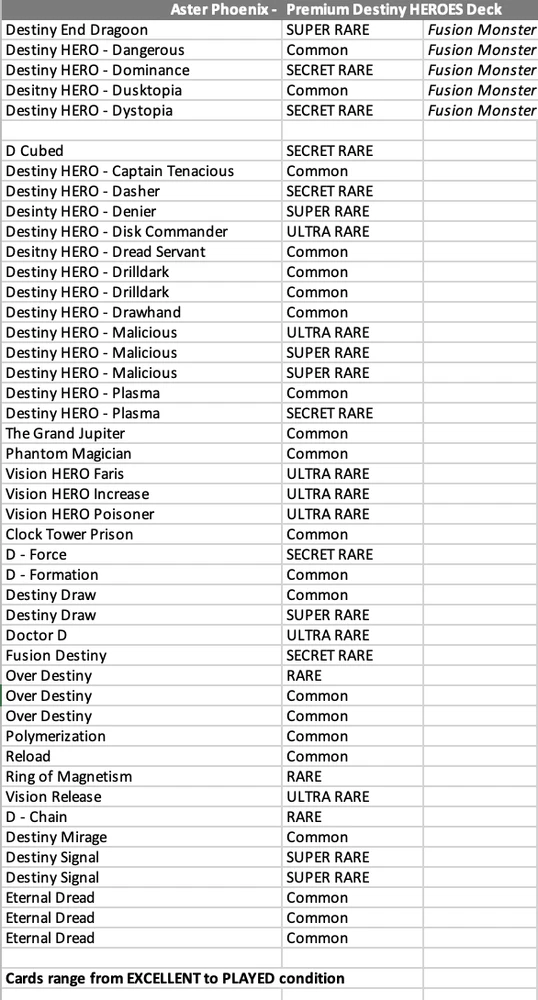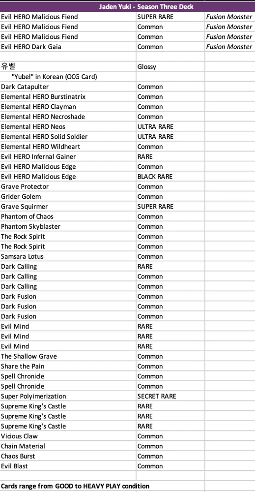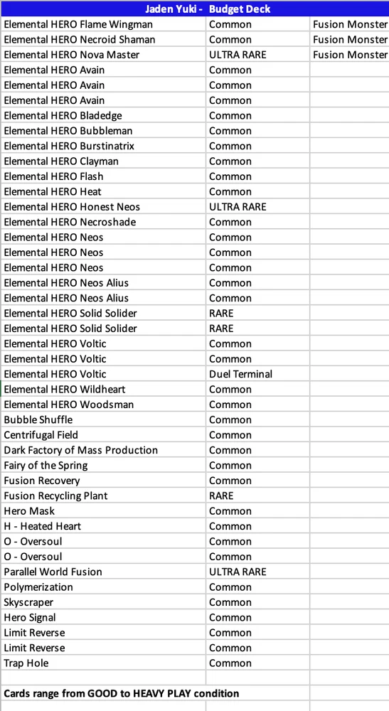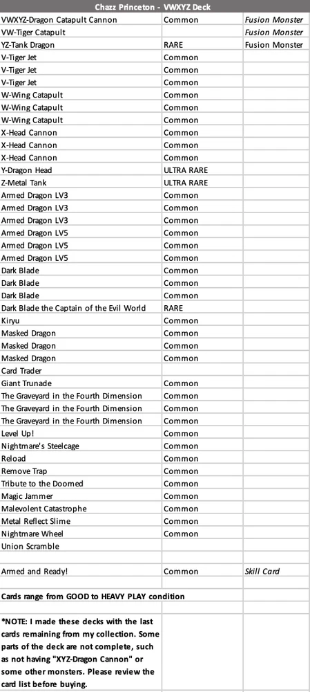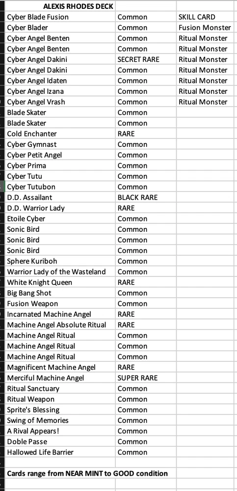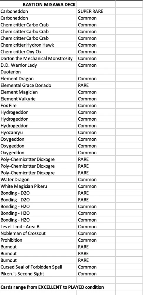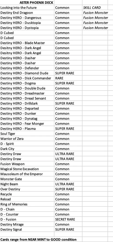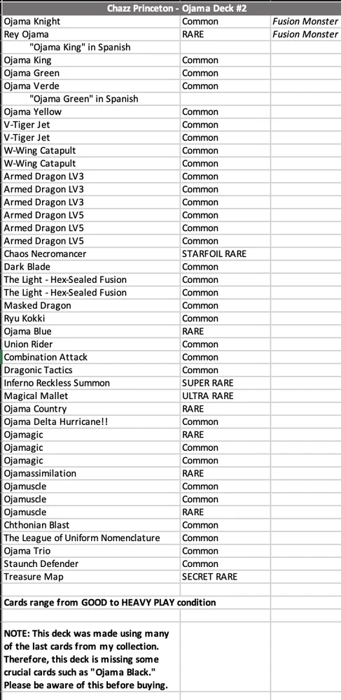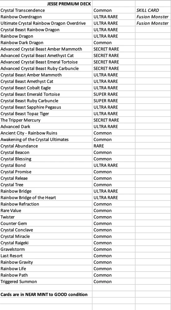 Character Decks from the Yu-Gi-Oh! GX Anime/Manga series ***New decks are currently being added. Check my store for more decks. ITEM HISTORY: These cards are all authentic Konami Yu-Gi-Oh! cards. I made the decks myself using cards from my collection. Please consult the card list in the photos to see the cards. These decks were not made to be competitive; they are based on decks that I build with friends for friendly, fun duels to play like the characters. SELLER HISTORY: I have been selling on eBay for many years now, specializing in Yu-Gi-Oh! cards. Because my daytime job can be demanding, I have decided to start selling nearly my entire collection. It may take me a while to get the listings up, so check back for new listings. SHIPPING: Decks will be shipped via USPS. Decks are packaged tightly to protect the cards and then shipped in a mailing envelope. You will have options to upgrade your shipping to Priority Mail for faster delivery. VOLUME PRICING: If you buy multiple listings from me during your checkout, you will significant discounts! Feel free to ask any questions you may have about the listings.