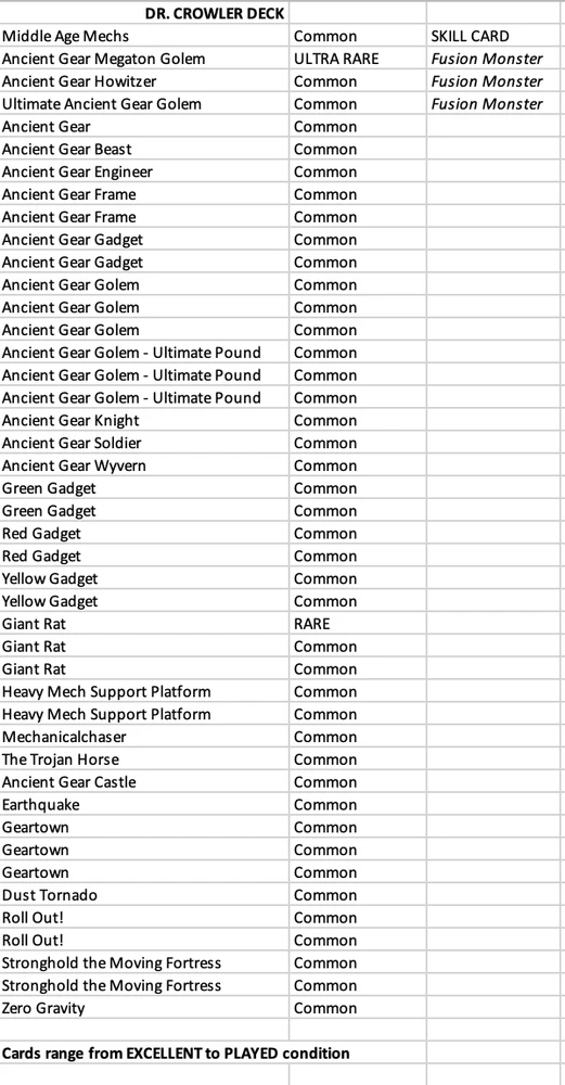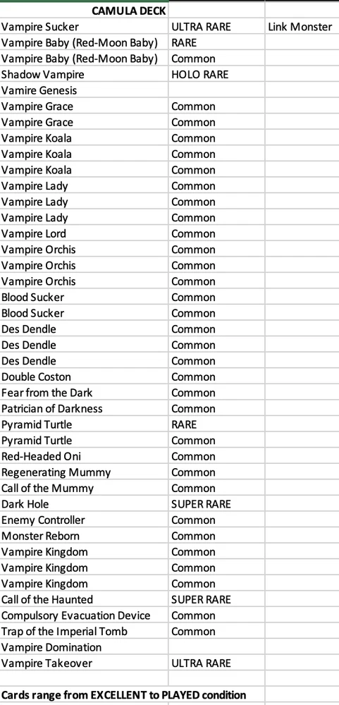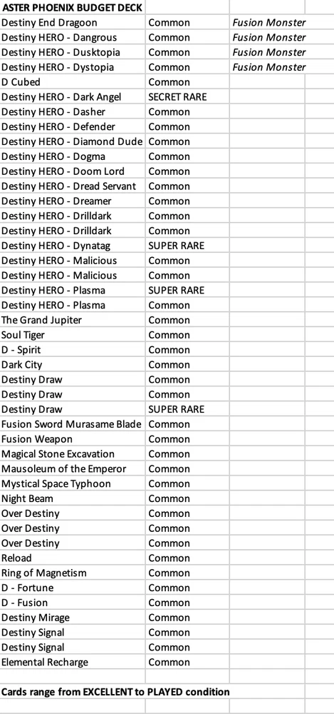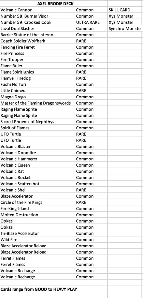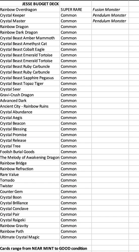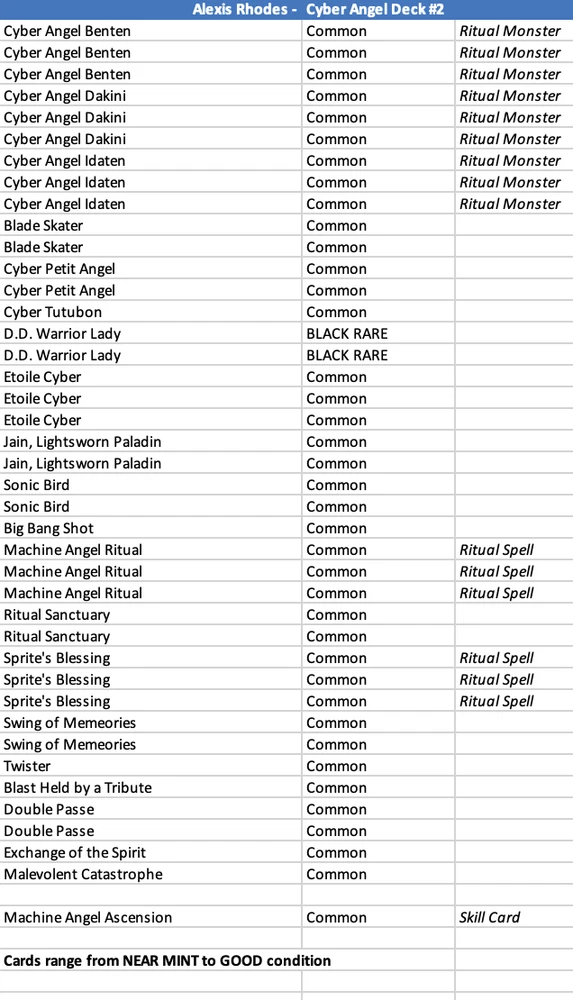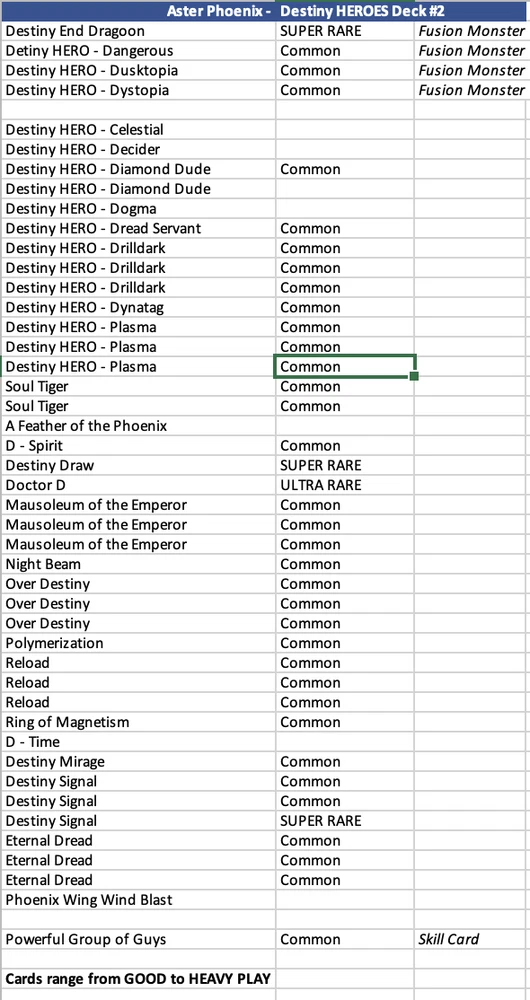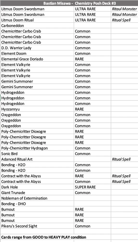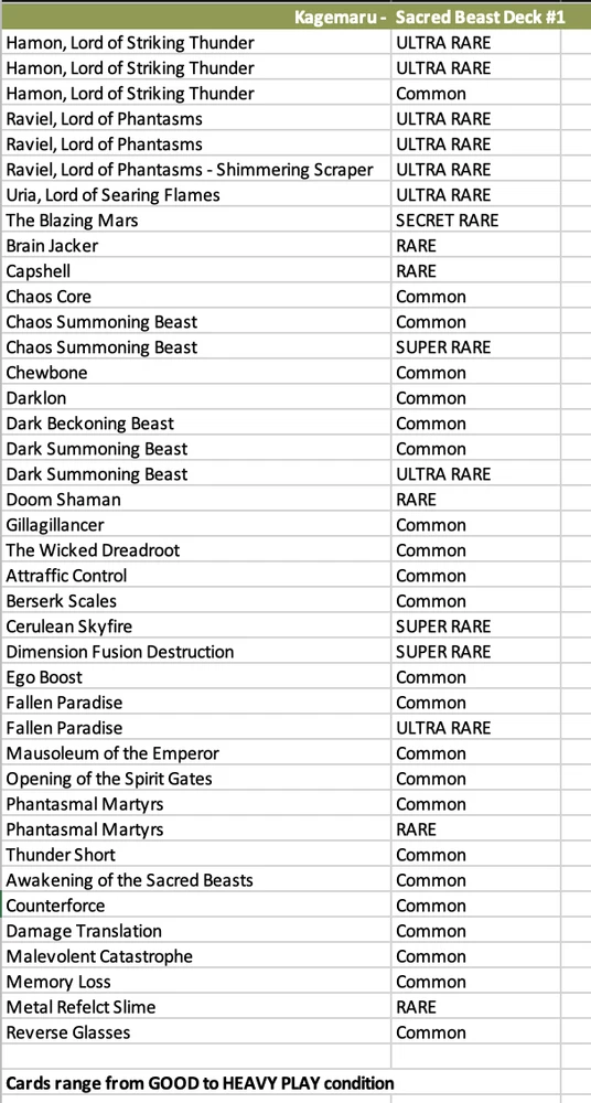 Character Decks from the Yu-Gi-Oh! GX Anime/Manga series ***New decks are currently being added. Check my store for more decks. ITEM HISTORY: These cards are all authentic Konami Yu-Gi-Oh! cards. I made the decks myself using cards from my collection. Please consult the card list in the photos to see the cards. These decks were not made to be competitive; they are based on decks that I build with friends for friendly, fun duels to play like the characters. SELLER HISTORY: I have been selling on eBay for many years now, specializing in Yu-Gi-Oh! cards. Because my daytime job can be demanding, I have decided to start selling nearly my entire collection. It may take me a while to get the listings up, so check back for new listings. SHIPPING: Decks will be shipped via USPS. Decks are packaged tightly to protect the cards and then shipped in a mailing envelope. You will have options to upgrade your shipping to Priority Mail for faster delivery. VOLUME PRICING: If you buy multiple listings from me during your checkout, you will significant discounts! Feel free to ask any questions you may have about the listings.