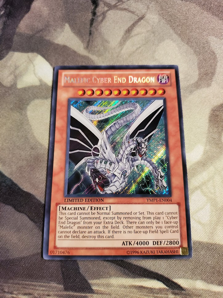 Yugioh - Malefic Cyber End Dragon YMP1-EN004 LP Limited Secret Rare Product This a Yugioh Product that is being sold! Condition is exactly as pointed out in title. For you're reference: NM: Near Mint VLP: Very Lightly Played LP: Lightly Played MP: Moderately Played HP: Heavily Played Shipping This listing will be shipped via card sleeve/penny sleeve and a top loader via letter mail. If you are purchasing an order of over $150 I will provide shipping with tracking free! Contact If you have any questions whether it be more pictures of the back or clarification on an order please contact me! We will do everything to Help! Also if you have multiple items or even have specific things you are looking for, reach out and we might just have it! There are no refunds, items are final sale! If the item has been incorrectly described or wrongly sent, please send images and we will sort it out right away! If the product has X2 or X3, it means it will either come with 2 of the same card or 3 of the same card. Be sure to always check the title of the listing! Great quality products that we ship across North America! Be sure to leave a review when you receive the item! Collection and Bulk Pokemon/Yugioh Purchases If you have any collections or bulk cards that you wish to sell please contact me and send pictures of what you're looking to sell! Rates: Contact me for rates! Reminder: I am looking to make profit when buying and selling, so please when reaching out realize that we both have to profit off the transaction!