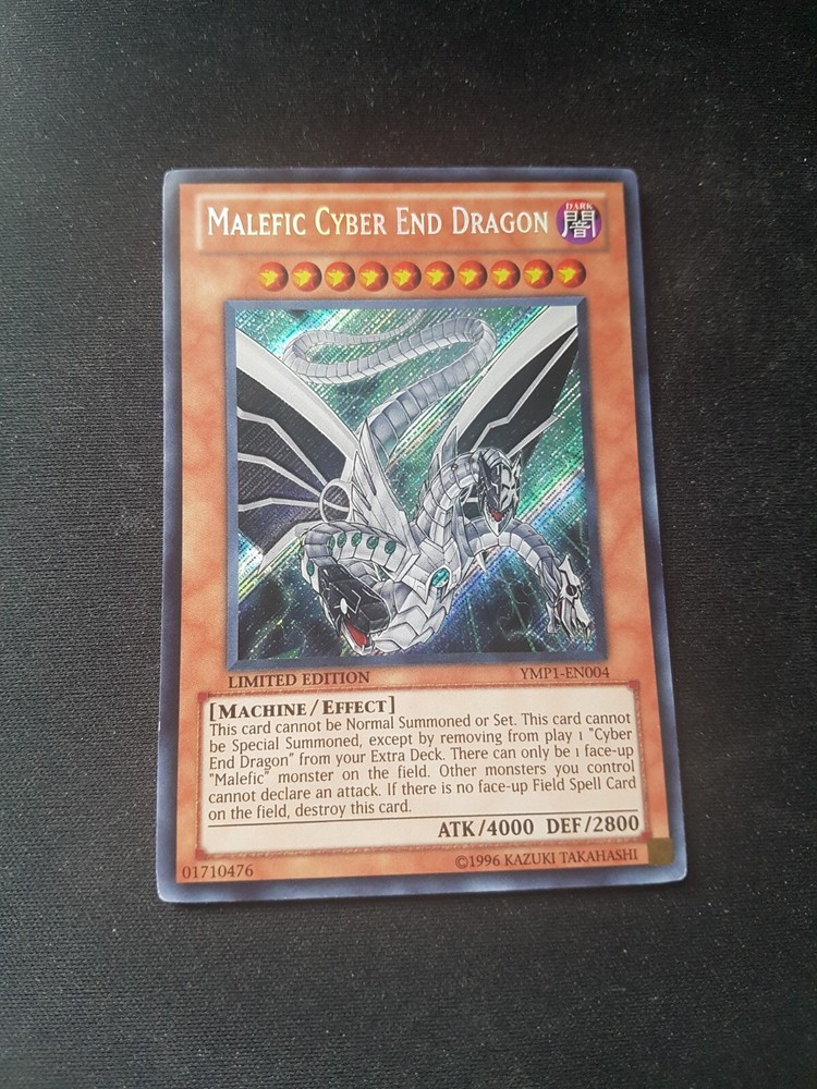 Yugioh! Malefic Cyber End Dragon YMP1-EN004 Secret Rare Limited Edition NM. Will only send to buyers in UK. Card has been barely used and kept in a smoke-free home in a safe storage area. The card will be sent in a sleeve and a plastic top loader to ensure no damage to the item. If there are any questions please feel free to message me and I will respond as soon as possible.