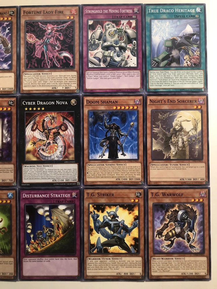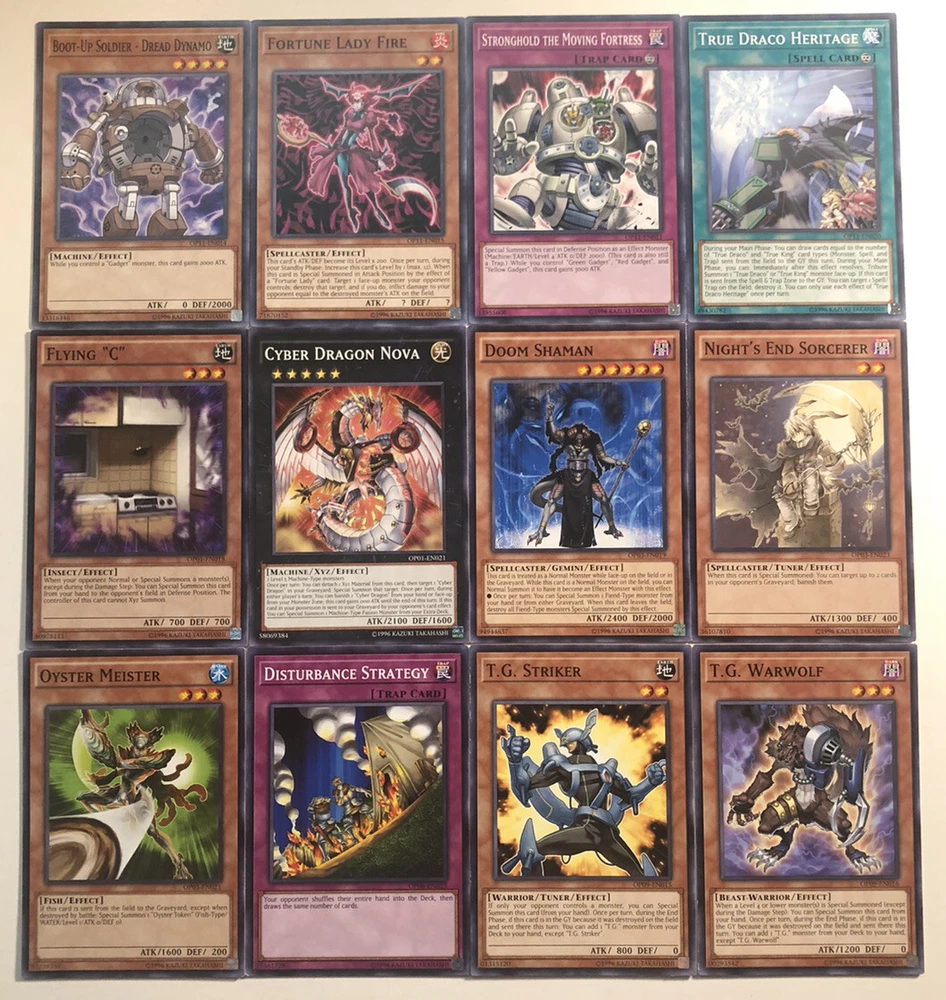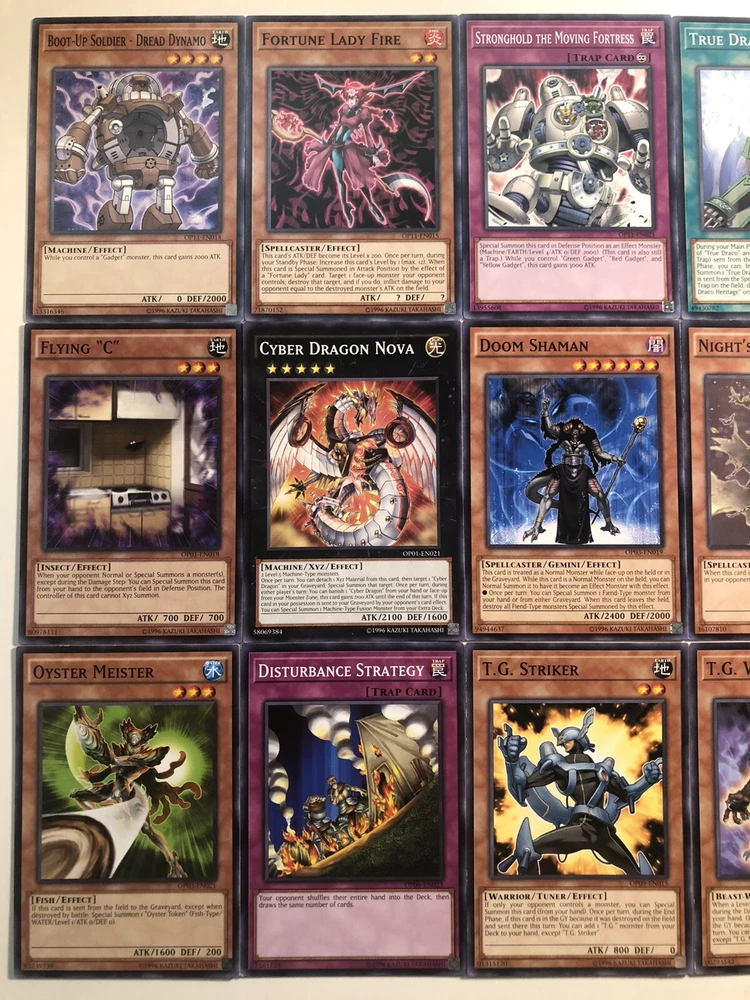 Yugioh OTS Tournament Pack Card Lot - Near Mint - OP01 OP03 OP06 OP09 OP11. This is a lot for 12 OTS TOURNAMENT PACK cards. The cards included are Cyber Dragon Nova OP01-EN021 FLYING “C” OP01-EN018 Nights End Sorcerer OP03-EN023 Doom shaman OP03-EN019 Oyster Meister OP03-EN021 DISTURBANCE STRATEGY OP06-EN023 T.G. STRIKER OP09-EN015 T.G. WARWOLF OP09-EN016 Boot-Up Soldier - Dread Dynamo OP11-EN014 Fortune Lady Fire OP11-EN015 Stronghold the moving fortress OP11-EN021 True Draco Heritage OP11-EN020 All are NM PLEASE CHECK PICS Make me an offer