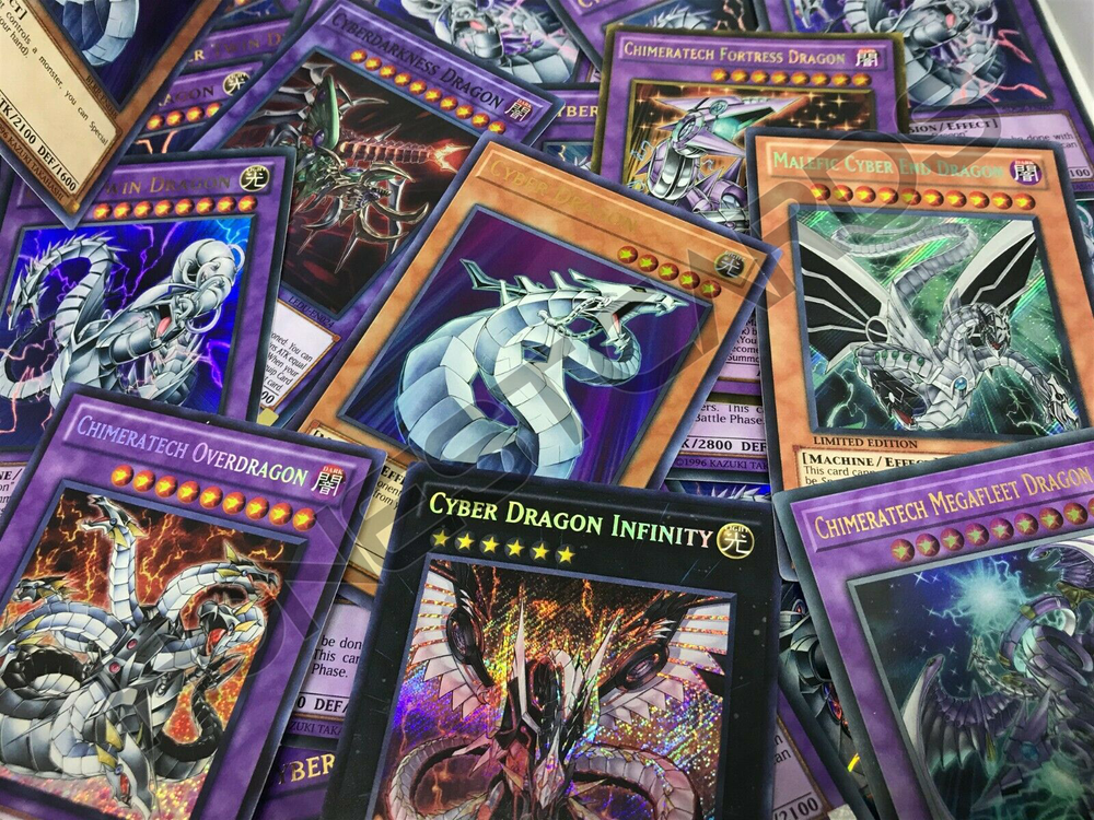 Hey guys I am new to Ebay so give me feedback or ask questions if your unsure about something. Happy Bidding!!! **Picture may have been edited due to Inventory Changes Please read description Below.** Shipping - All orders will be shipped with bubble mailer and a protective case. - I ship to both Domestic (U.S.) and International destinations! Payment - Please pay within 3 days of your order to avoid an Unpaid Item Case. This just helps me run things smoothly for other bidders/buyers and myself. Will appreciate if you please leave feedback when you receive your item, and I will leave feedback as well. Contact me if anything is wrong with your order so I can have a chance to fix the issue- Your satisfaction is most important! Please Allow up to 5-10 Business days before the item will be shipped as I am in grad school and work full time. **If you are a international buyer, Customs Fees are the responsobility of the Buyer** A bonus for ordering you will also Get a Free Holo Card from my collection. It maybe Super Rare, Ultra Rare, or SECRET Rare!!! As a Bonus Gift for buying my auction you will Recieve a Bonus Free Holo Card. It can be Super Rare, Ultra Rare, or Secret Rare or even GHOST Rare!!! You will receive the following items: You will receive: 4 Cyber Dragons/CyberDark Dragons in Secret Rare/Ultra Rare Holographic Foil from the Card List 5 Bonus! FREE! Yu-Gi-Oh Cards! 1 Common Yu-Gi-Oh! Card 1 Silver Lettered Rare Yu-Gi-Oh! Card 1 Gold Lettered Ultra Rare Holographic Yu-Gi-Oh! Card 1 Platinum Rare Holographic Yu-Gi-Oh! Card 1 Gold Rare Holographic Yu-Gi-Oh! Card Cyber Dragons & Cyberdark Dragons Card List: Cyber Dragon Cyber Dragon Herz Cyber Eltanin Cyber Twin Dragon Cyber End Dragon Cyber Dragon Sieger Cyber Dragon Nova Cyber Dragon Infinity Chimeratech Rampage Dragon Chimeratech Overdragon Chimeratech Fortress Dragon Chimeratech Megafleet Dragon CyberDark Dragon CyberDark Cannon CyberDark Keel CyberDark Edge CyberDark Horn CyberDark Claw CyberDarkness Dragon Malefic Cyber End Dragon