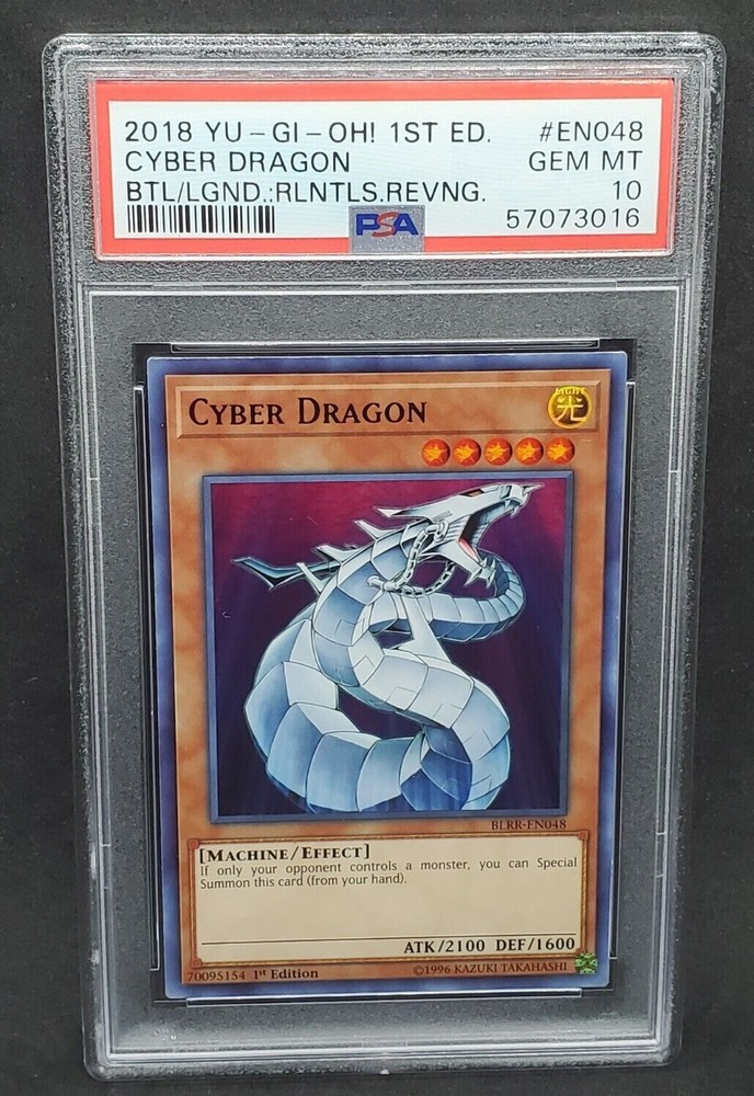 You are bidding on a Yugioh PSA 10 GEM MINT Cyber Dragon 1st Edition Ultra Rare Card# BLRR-EN048 !!! This card has been graded as GEM MINT - a perfect 10 - by PSA!!! An incredible addition to any collection! Do note that multiple PSA 10 graded copies of this card are available; the specific PSA Certification Number you get may vary slightly from the one in the photo. Shipping is FREE on this item in the United States! All PSA cards will be shipped in a padded envelope or appropriately sized padded box, with a graded card sleeve surrounding the PSA Case. For orders over $250, please be advised that signature confirmation is required. For any questions regarding shipping or otherwise, please contact us prior to purchase. Please allow 2-3 business days handling time. Make sure to check out our other listings for all of your favorite Trading Card Games! Thanks for shopping at Yeti Gaming!