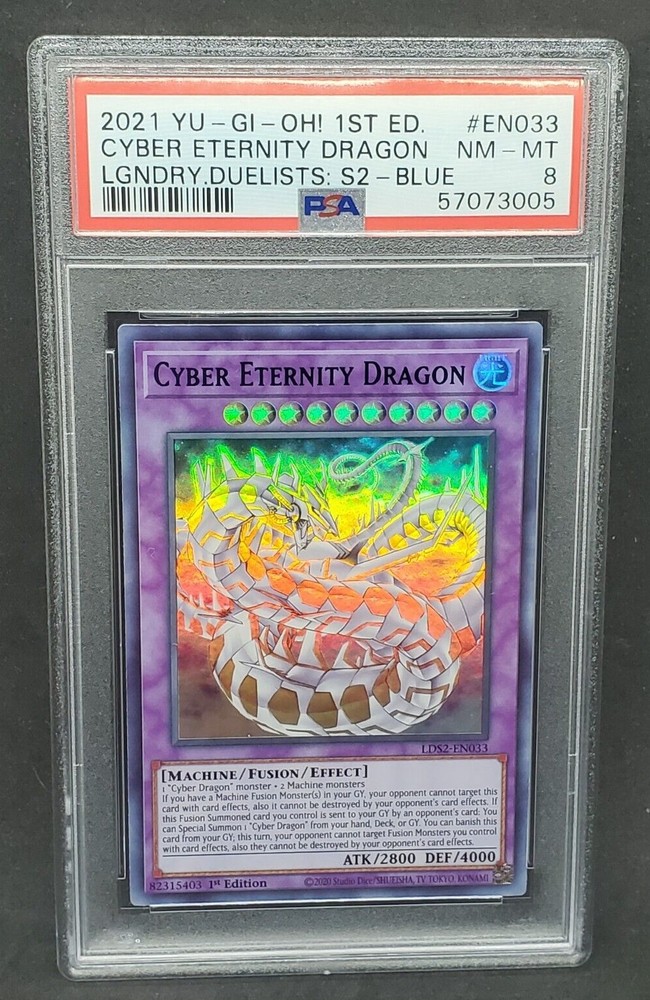 You are bidding on a Yugioh PSA 8 NM-MT Cyber Eternity Dragon (Blue) 1st Edition Card# LDS2-EN033 !!! This card has been graded as NM-MT - an 8 - by PSA!!! An excellent addition to any collection! We are a US Seller! Shipping on all items is FREE inside the United States. For international orders we use eBay's Global Shipping Program. All shipping charges, taxes, fees, etc. for international orders are calculated and collected by eBay at checkout.! Do note that multiple PSA 8 graded copies of this card are available; the specific PSA Certification Number you get may vary slightly from the one in the photo. All PSA cards will be shipped in a padded envelope or appropriately sized padded box, with a graded card sleeve surrounding the PSA Case. For orders over $250, please be advised that signature confirmation is required. For any questions regarding shipping or otherwise, please contact us prior to purchase. Please allow 2-3 business days handling time. Make sure to check out our other listings for all of your favorite Trading Card Games! Thanks for shopping at Yeti Gaming!