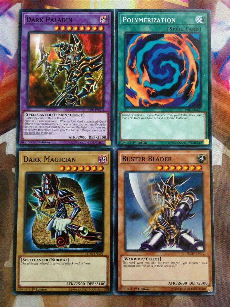 Hello all I am a New Ebay Seller!!! I am a Female Yugioh & Magic Collector!!! Happy Bidding!!! A bonus for ordering you will also Get a Free Holo Card from my collection. It maybe Super Rare, Ultra Rare, or SECRET Rare!!! Picture may have been edited due to Inventory Changes Please read description Below Please Allow me the Set Handling time before your item will be shipped! It may take the full handling time set Thank You!!! Item for sale is: 1x Dark Paladin 1x Dark Magician 1x Buster Blader 1x Polymerization