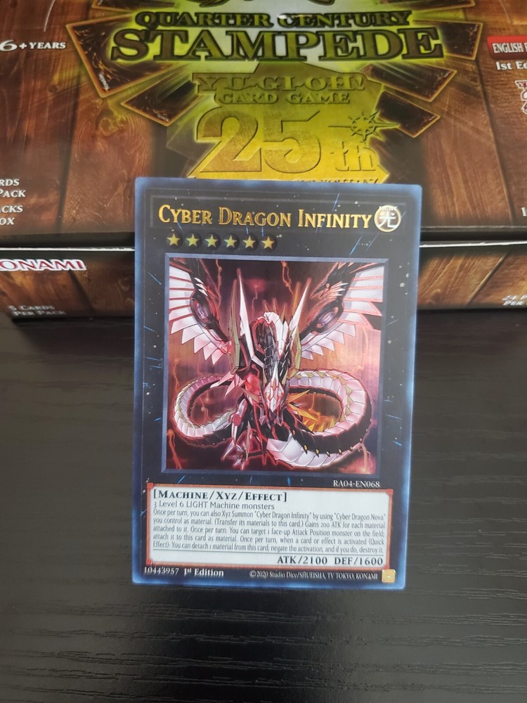 Yu-Gi-Oh! - Quarter Century Stampede - Cyber Dragon Infinity - Ultra Rare - RA04 -EN068 Condition: Near Mint or better. Shipping: The card will be carefully shipped via USPS within 48 business hours of payment. Check out my eBay store for more great cards. I list new cards nearly every day.