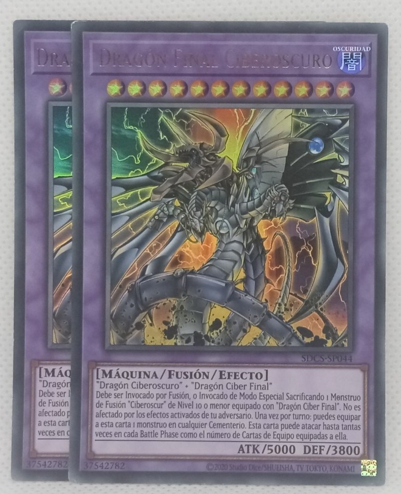 Yugioh TCG 2x Cyberdark End Dragon SDCS-EN044 Ultra Rare LP Spanish Version Includes Cards without damages/minimum damage (see pictures for more information). Both cards are Unlimited. Handling time: 3 business days Shipping: Economy Shipping: Around USA, Mexico, Canada, South America and Caribbean, 15 to 30 business days Standard Shipping: Around USA, Mexico, Canada, South America and Caribbean, 7 to 10 business days Important: Orders less than 15 USD with economy shipping don't include tracking number, buy products in this store more than 15 USD and you receive certified shipping (tracking number is provided ) Now we can ship Around Europe (except Ukraine and Russia). Economy Shipping without tracking number: 2.50 USD. If you want a tracking number only for this product with economy shipping, add 3 USD. Any question you have, please ask me and I will response a soon as posible. " Import duties , taxes , and charges are not included in the item price or shipping cost. These charges are the buyer's responsibility. Please check with your country's customs office to determine what these additional costs will be prior to bidding or buying"