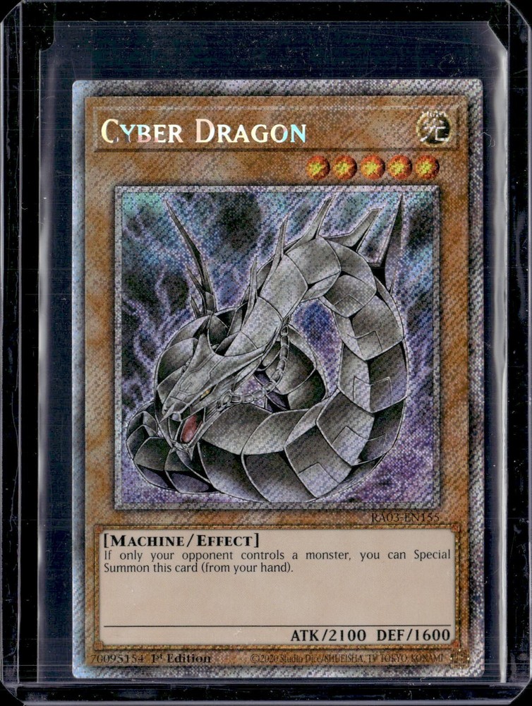 The product is a rare 1st Edition Platinum Foil Prismatic Cyber Dragon trading card from the Yu-Gi-Oh! TCG. It is part of the Yugioh! set manufactured by Konami. This non-sport trading card is a highly sought-after collectible for fans of the Yu-Gi-Oh! franchise.