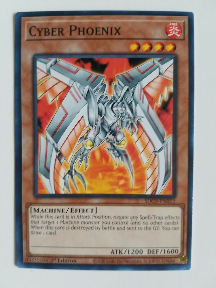 I have the machine monster card, " Cyber Phoenix " where you can negate any trap or spell cards that target any machine monsters. If this monster is destroyed by battle you can draw 1 card. This is something you can have to protect your machine monsters especially if you want to be like Zane Truesdale from Yugioh GX. You can combine this card with the likes of the Cyber Dragon archetype especially if you have Cyberend Dragon , Cyberdarkness Dragon or Cyber Over Dragon . Here is a link to the episodes of how this monster was used in the anime: https://www.youtube.com/watch?v=t11ettoB7D0 https://tubitv.com/tv-shows/462059/s02-e13-no-pain-no-game Buy this card right now or offer me a trade for the monster card, " Alexandrite Dragon " preferably, " PHSW-ENSP1 " or " LDK2-ENK12 "