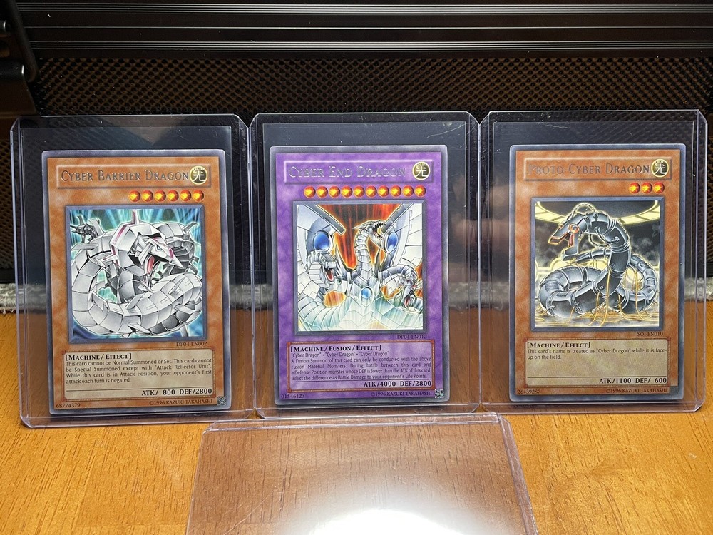 Yugioh TCG Lot of 3: Cyber-End Dragon, Cyber Barrier Dragon, Proto-Cyber Dragon All cards in NM condition. Hi everyone! I have decided to sell my Pokémon and yugioh card collections. All cards have been well loved and well looked after for the better part of my life. Card(s) will ship out in 1-3 business days. I will provide tracking number. Orders under $20 will ship in a plain white envelope with sleeve, top loader, and team bag. Orders above $20 will be shipped in a bubble wrapper with sleeve, top loader, and cardboard for additional protection. If you are interested in multiple cards, please look through my inventory and add all items to your cart before buying. This reduces shipping costs. Please message me with any questions through the process. I will do my best to respond as quickly as possible.