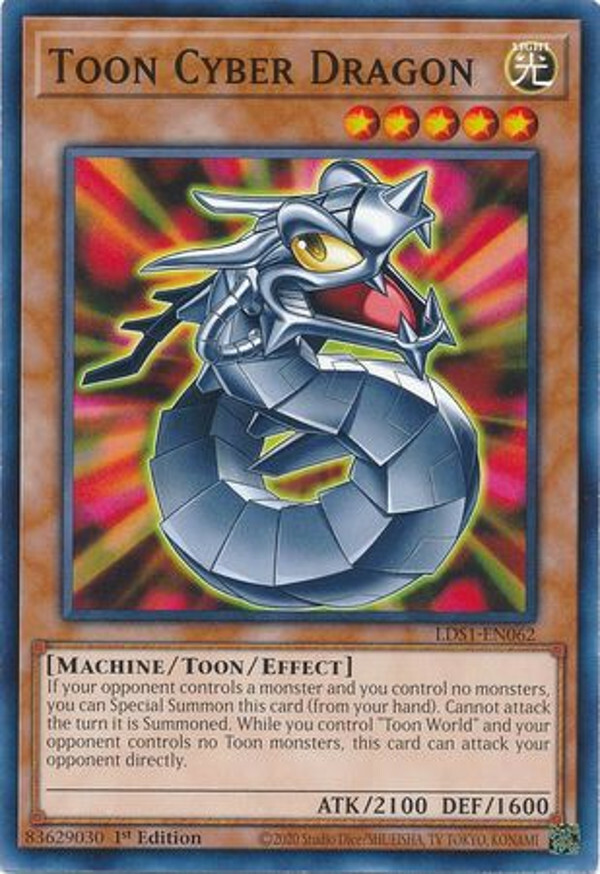 Toon Cyber Dragon 1st Edition The card is in NM condition. Also will include a free Holographic card which can be a rarity of Super, Ultra, Secret, etc! Card Information If your opponent controls a monster and you control no monsters, you can Special Summon this card (from your hand). Cannot attack the turn it is Summoned. While you control "Toon World" and your opponent controls no Toon monsters, this card can attack your opponent directly. Number: LDS1-EN062 Rarity: Common