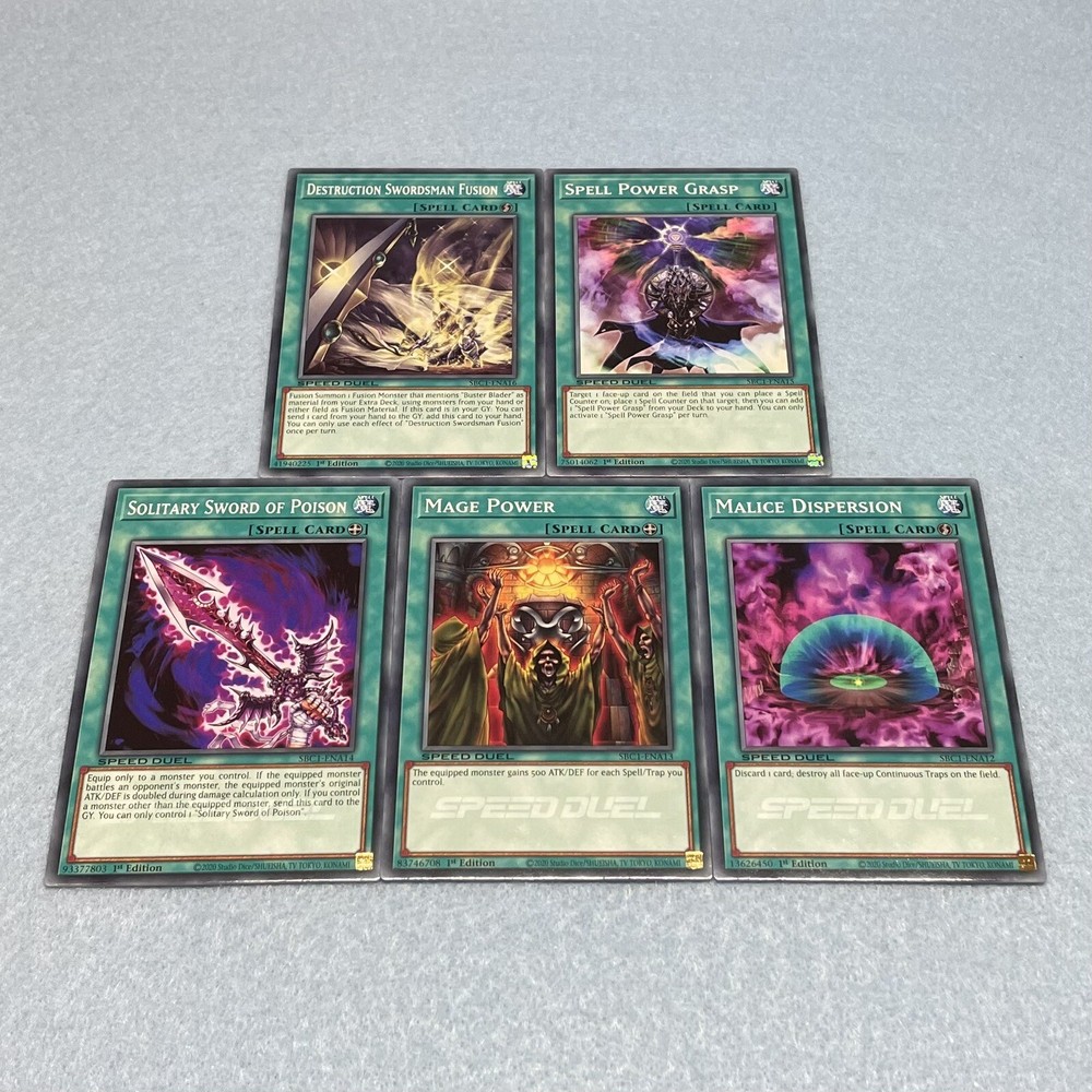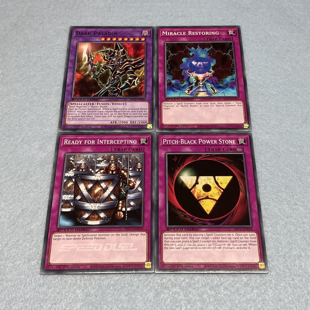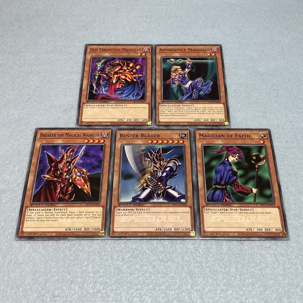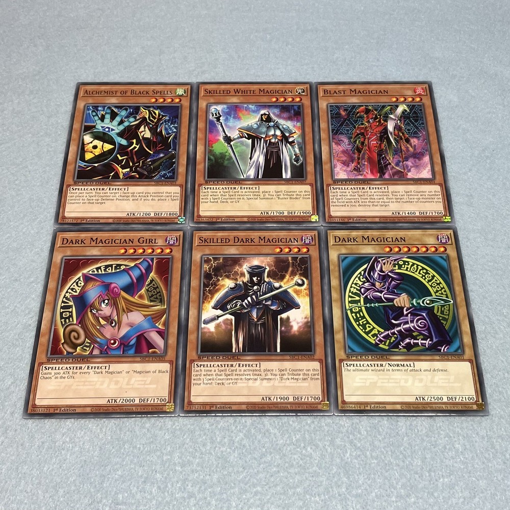 You will receive all of the cards listed. All cards are in near-mint condition 1 Dark Magician 1 Skilled Dark Magician 1 Alchemist of Black Spells 1 Blast Magician 1 Dark Magician Girl 1 Buster Blader 1 Skilled White Magician 1 Breaker the Magical Warrior 1 Apprentice Magician 1 Magician of Faith 1 Old Vindictive Magician 1 Malice Dispersion 1 Mage Power 1 Solitary Sword of Poison 2 Spell Power Grasp 1 Destruction Swordsman Fusion 1 Miracle Restoring 1 Pitch-Black Power Stone 1 Ready for Intercepting 1 Dark Paladin All cards are Speed Duel edition, and can be used in any Yu-Gi-Oh play format (including non-Speed Duel formats).