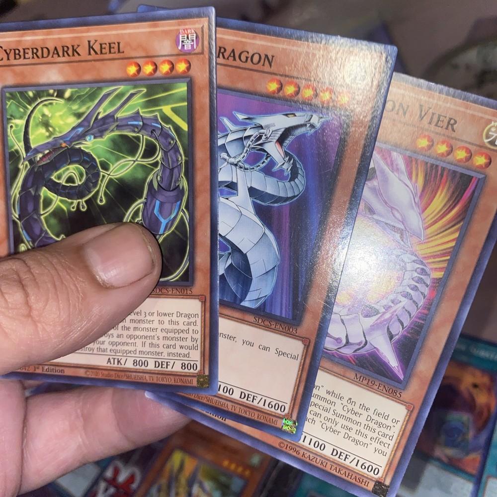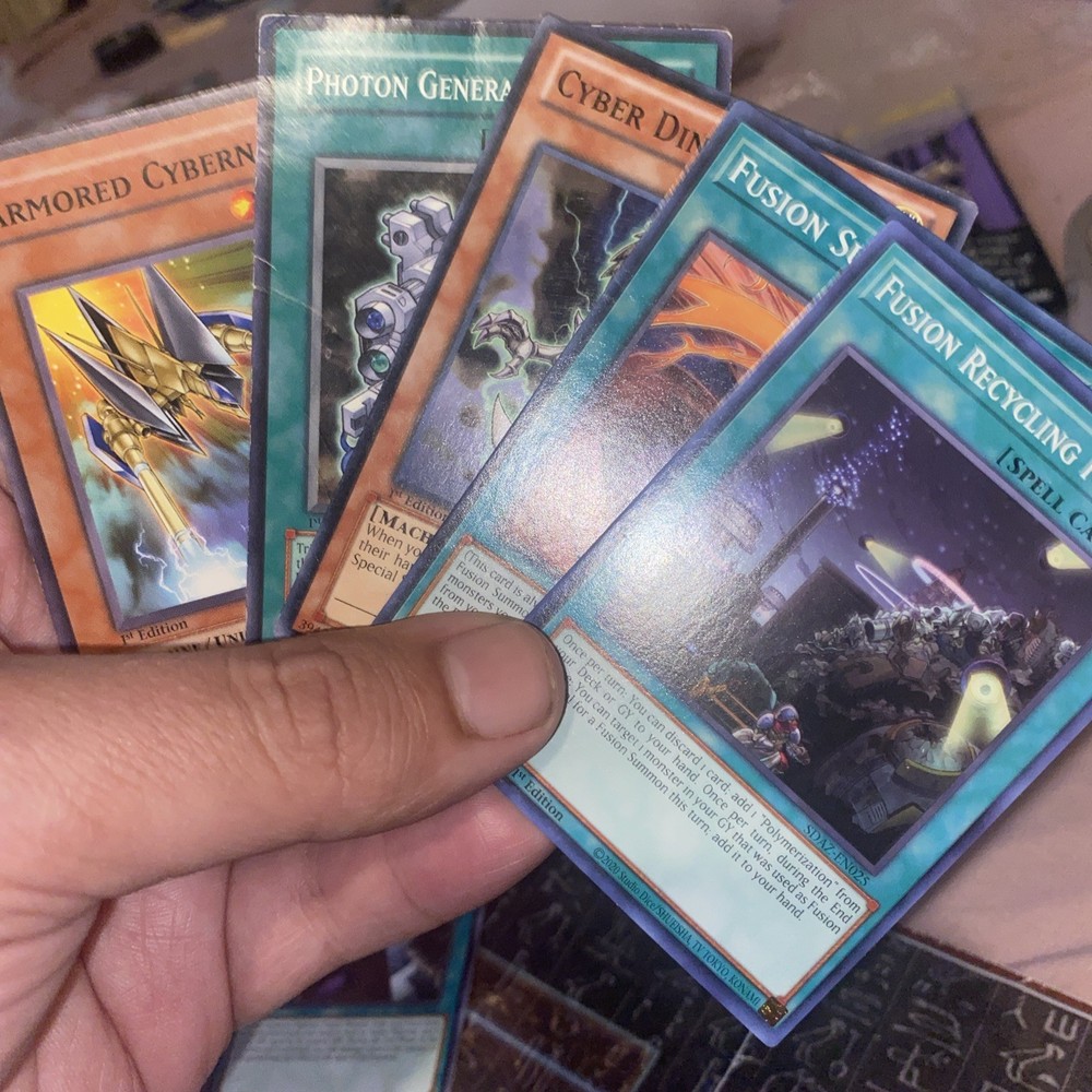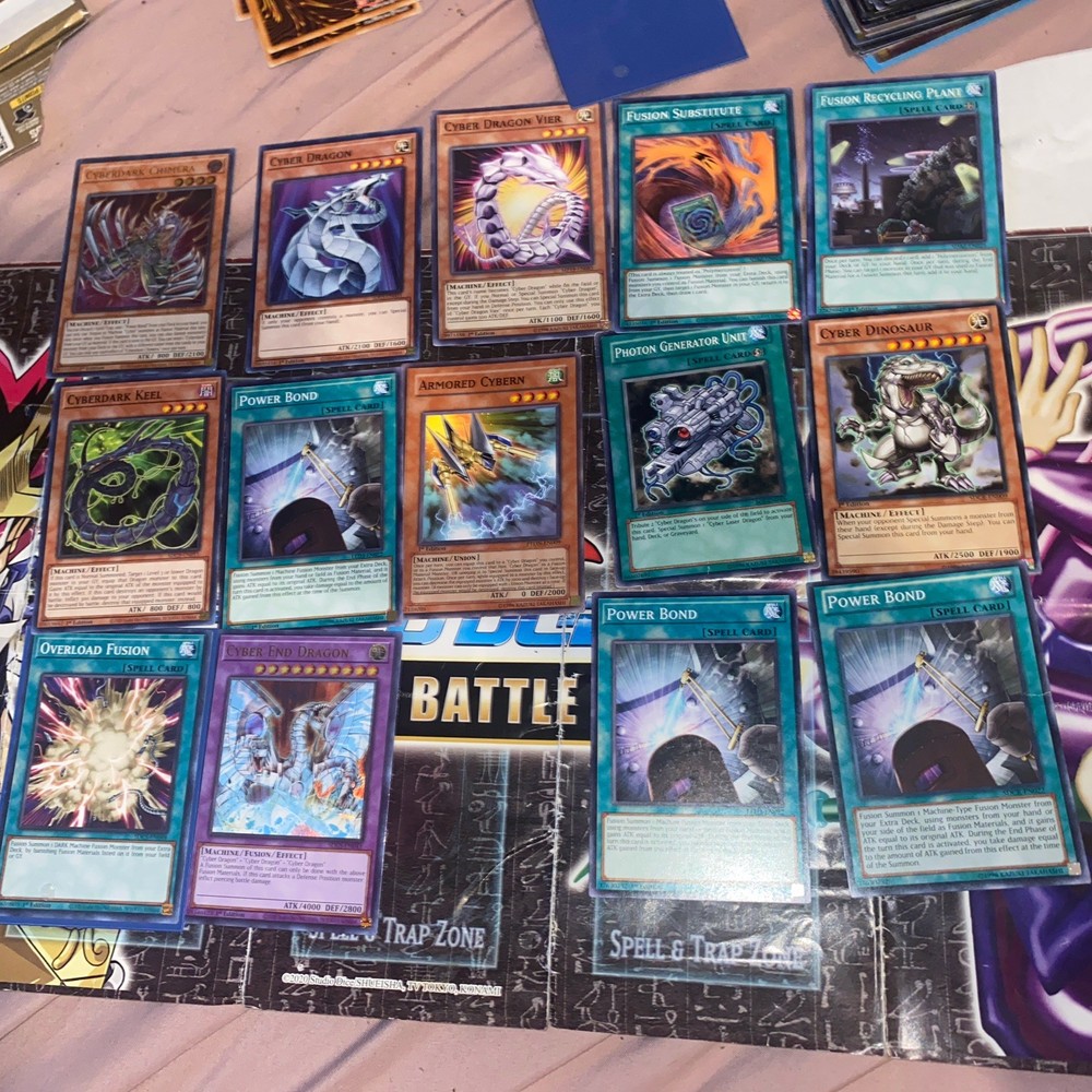 This is for part of saying Truesdale’s deck Cards included are llisted below Power bond led3 en022 x3 Photon generator unit soi en 045 Cyber dragon sdcs en 003 Cyber dinosaur sdcr Overload fusion Fusion substitute Cyber dark keel Cyber end dragon Fusion recycling plant Armored cybrrnn