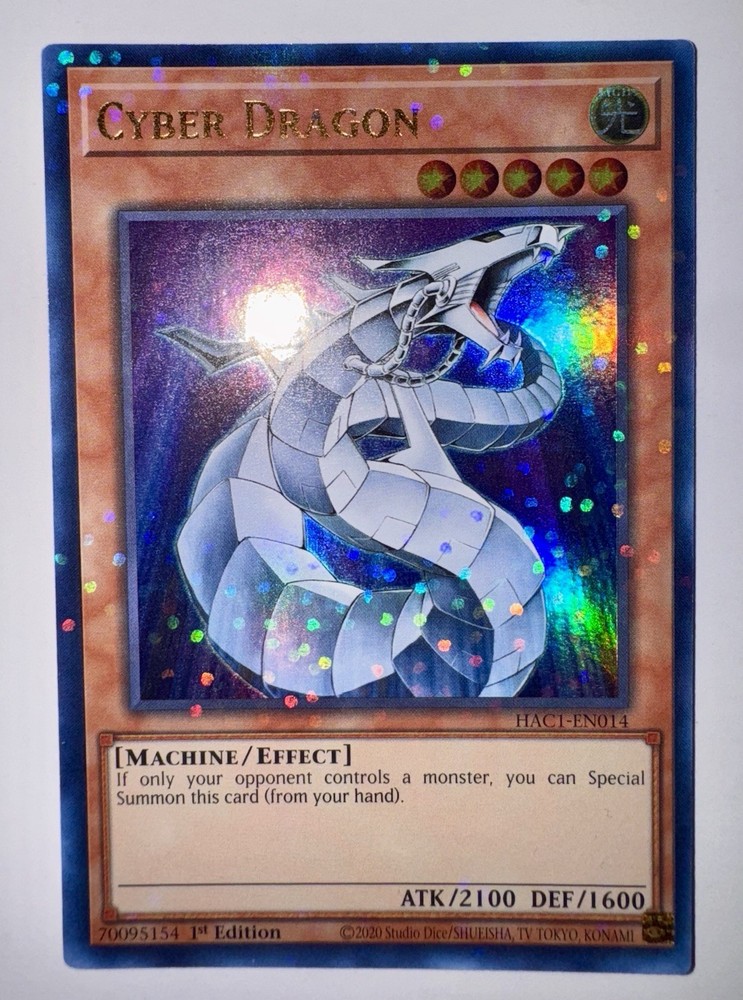 The Yugioh x1 Cyber Dragon Duel Terminal Ultra Rare HAC1-EN014 is a highly sought-after card in the Yu-Gi-Oh! TCG. This 1st Edition card from the Hidden Arsenal: Chapter 1 set features the iconic Cyber Dragon character in English language. Manufactured by Konami, this Monster Card is a valuable addition to any Yu-Gi-Oh! collection, with its Duel Terminal Ultra Parallel Rare status making it a rare and desirable find for collectors and players alike.