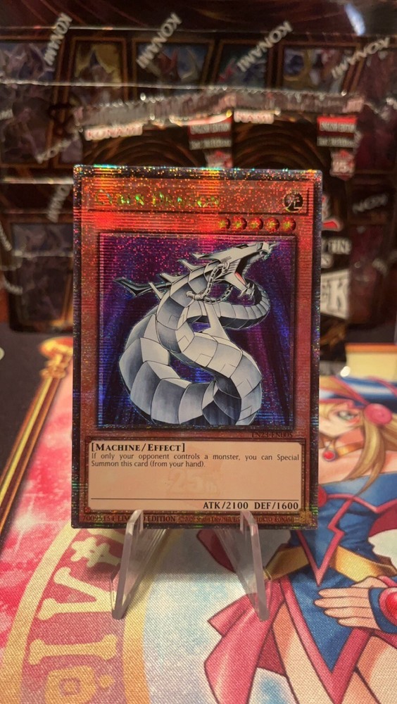 Up for sale is a rare quarter century secret limited edition Cyber Dragon monster card from the Yu-Gi-Oh! TCG. This English language card from the 2023 Tin of Dueling Heros set is in near mint condition and would make a great addition to any collector's Yu-Gi-Oh! card collection. The red-colored card features the iconic Cyber Dragon character from the Yu-Gi-Oh! franchise and is manufactured by Konami. Don't miss out on the chance to own this highly sought-after card!