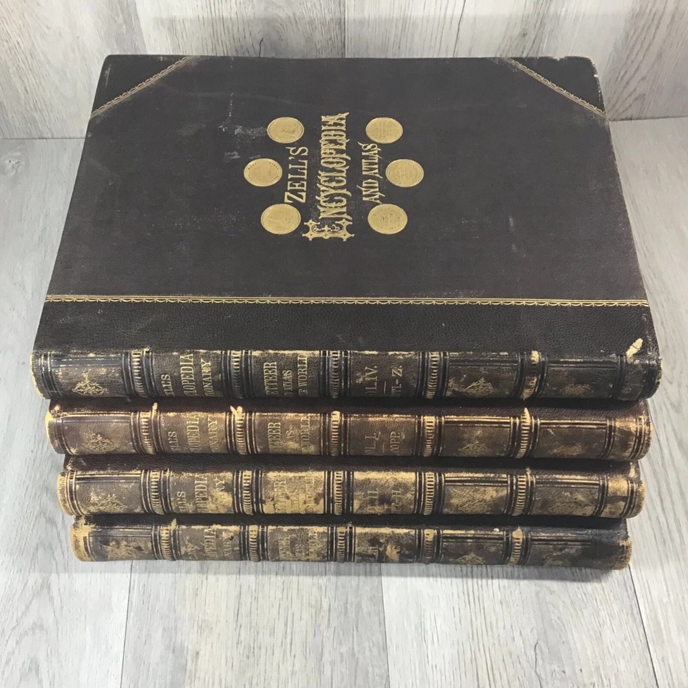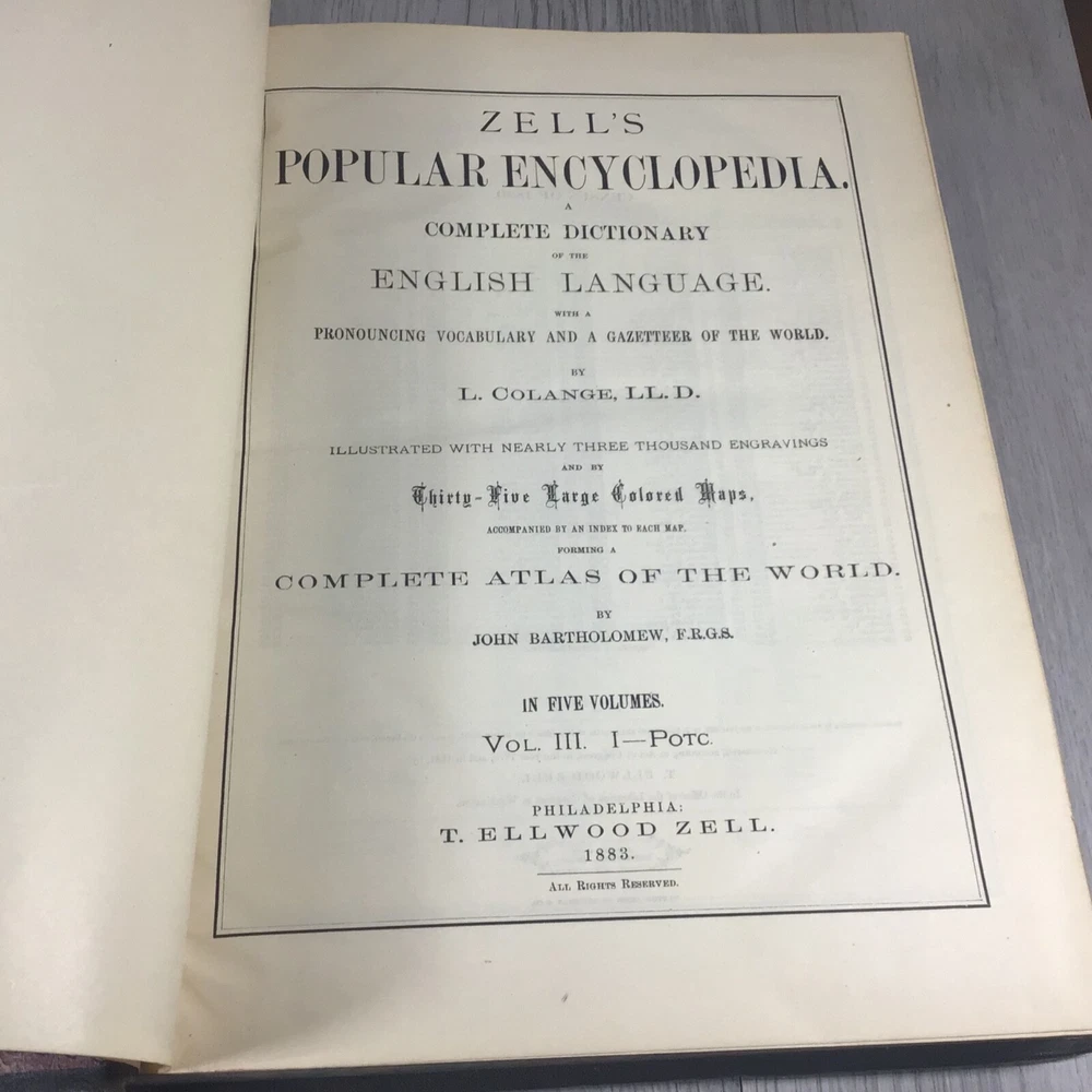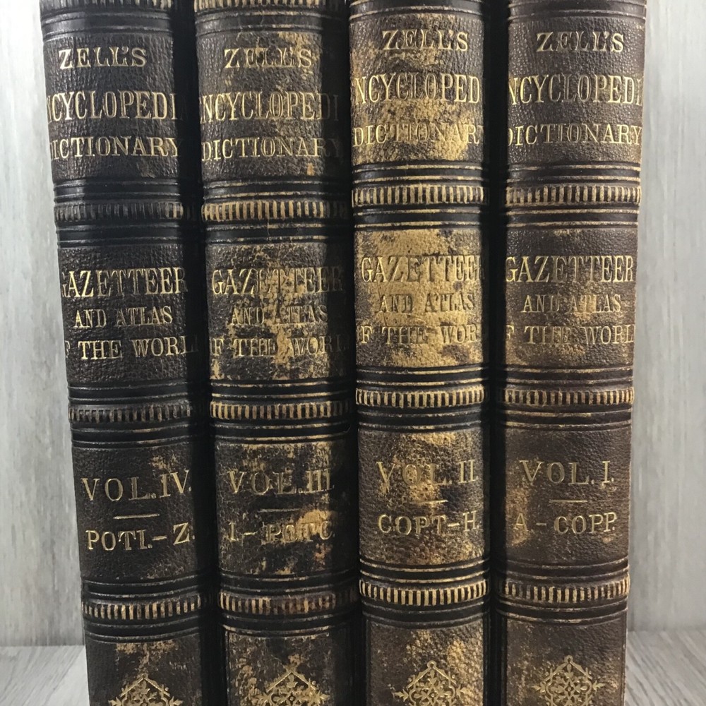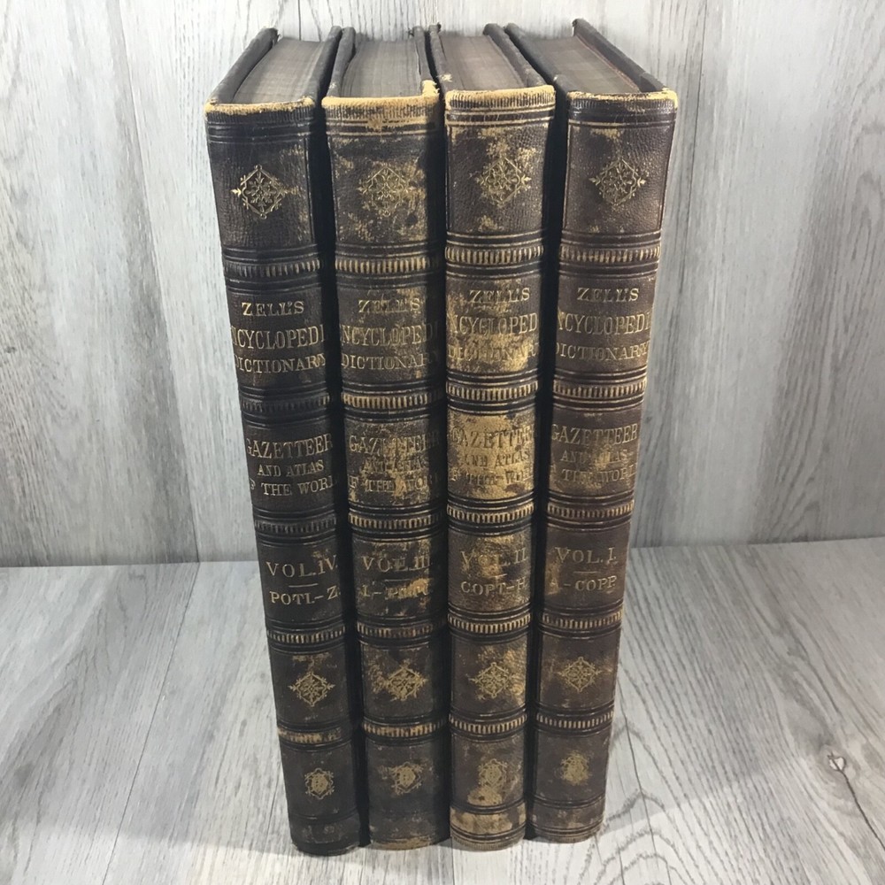 This antique set of ZELL'S 1883 Encyclopedia Dictionary Volumes I, II, lll & lV Gazateer are in good pre-owned condition, especially considering their age. There is obvious cosmetic wear on the covers particularly around the corners, please see the photos. There is what appears to be a manufacturing flaw on one page where the page was not properly cut, again, please see the photos. This flaw did not seem to have affected the colorful edge printing in any way. The interior of the books are in pretty decent condition as well. There is some slight yellowing as would be expected from books of this era, the inside cover sheets are very colorful and in great shape. While examining the pages of the books I did come across the personal notes and pictures that were hidden within these historic pages. I thought they were interesting and might add a flair of further interest to whoever gets these books… they are included in the listing. (I think they were notes that someone made preparing to play a “Guess Who I Am” game, using these volumes as background, study material. I just thought they were really cool and didn’t want to just throw them out).