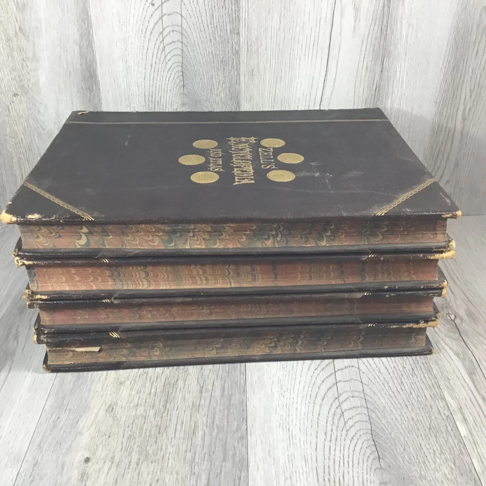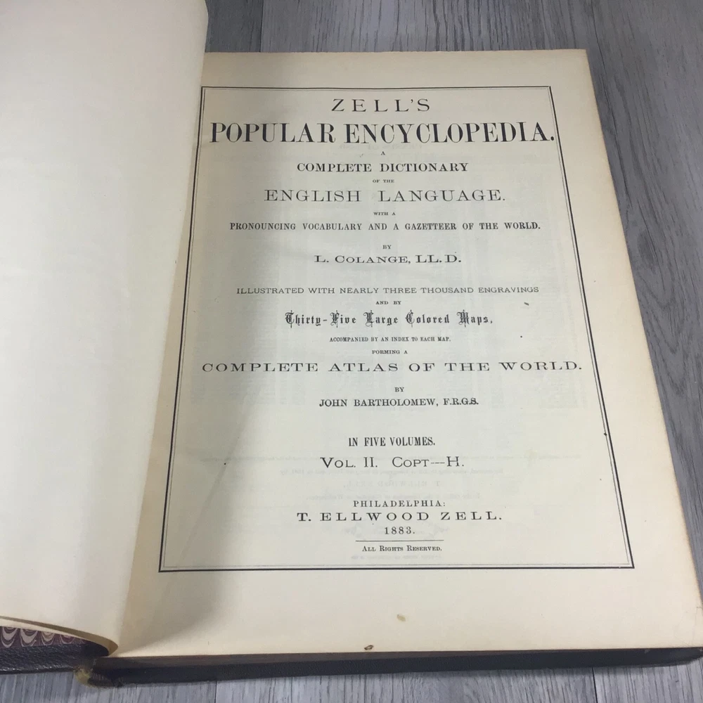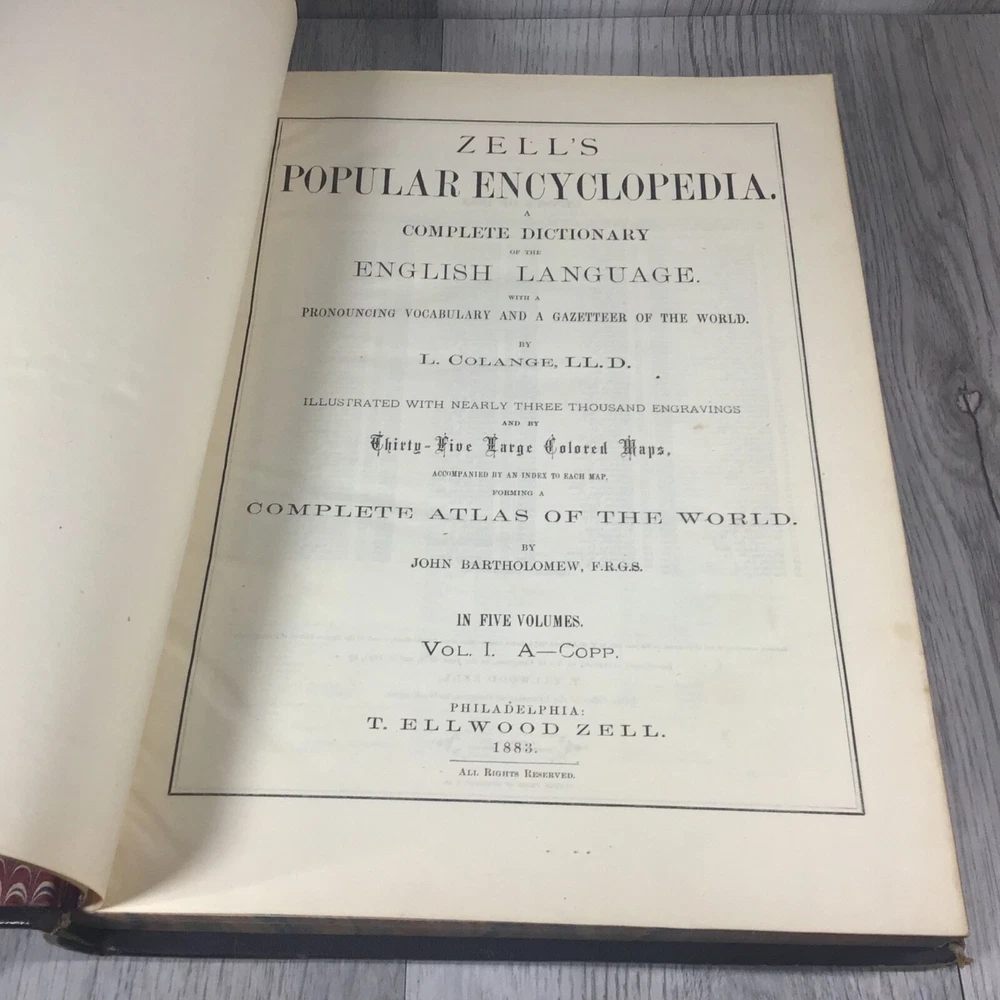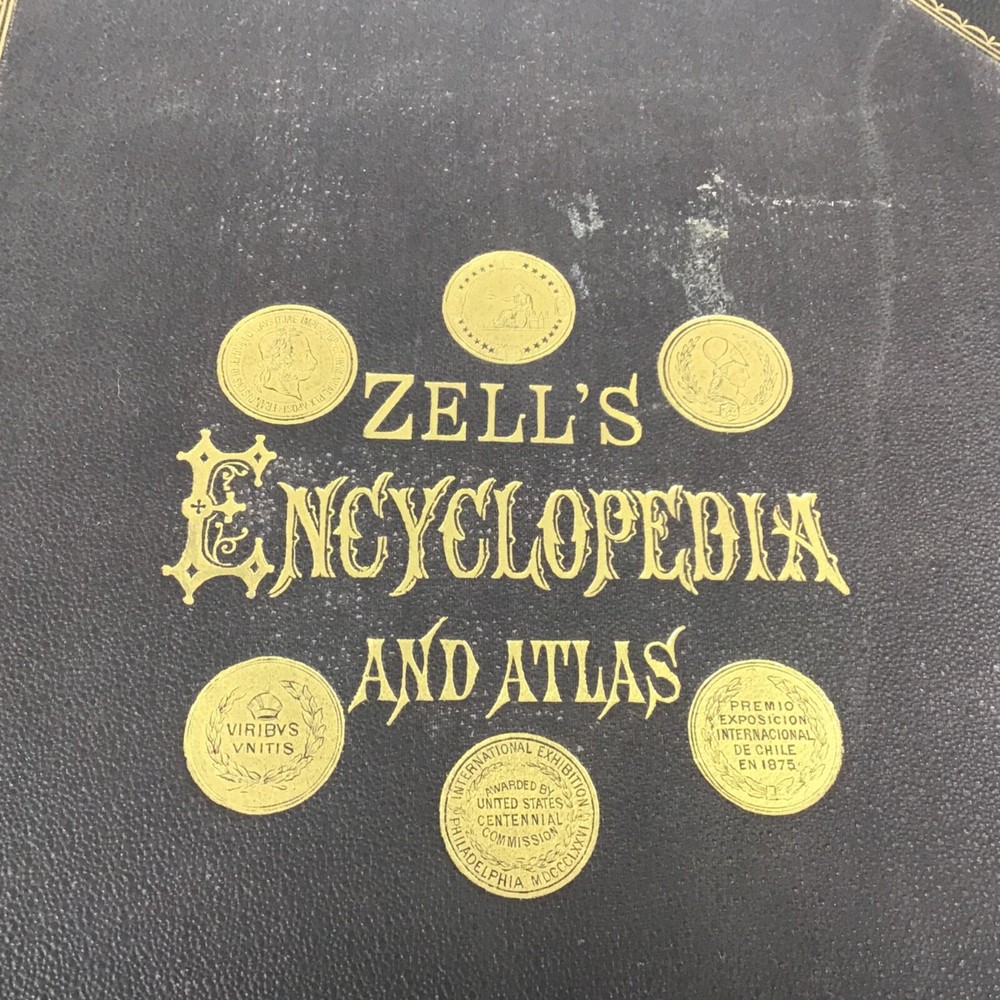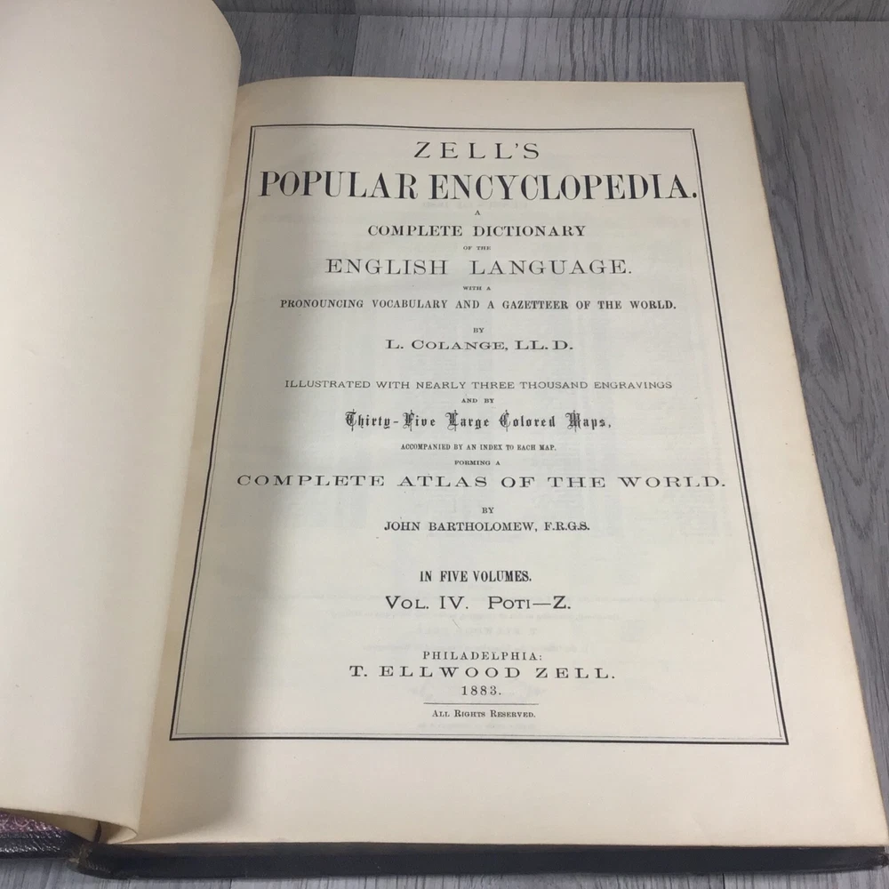 This antique set of ZELL'S 1883 Encyclopedia Dictionary Volumes I, II, lll & lV Gazateer are in good pre-owned condition, especially considering their age. There is obvious cosmetic wear on the covers particularly around the corners, please see the photos. There is what appears to be a manufacturing flaw on one page where the page was not properly cut, again, please see the photos. This flaw did not seem to have affected the colorful edge printing in any way. The interior of the books are in pretty decent condition as well. There is some slight yellowing as would be expected from books of this era, the inside cover sheets are very colorful and in great shape. While examining the pages of the books I did come across the personal notes and pictures that were hidden within these historic pages. I thought they were interesting and might add a flair of further interest to whoever gets these books… they are included in the listing. (I think they were notes that someone made preparing to play a “Guess Who I Am” game, using these volumes as background, study material. I just thought they were really cool and didn’t want to just throw them out).