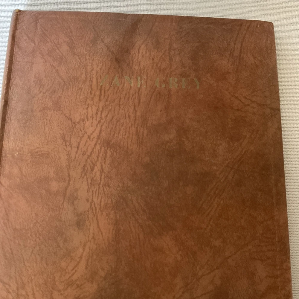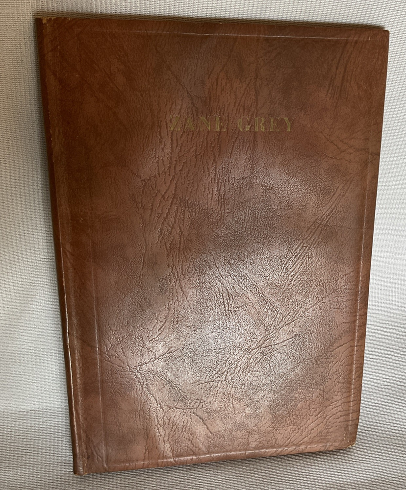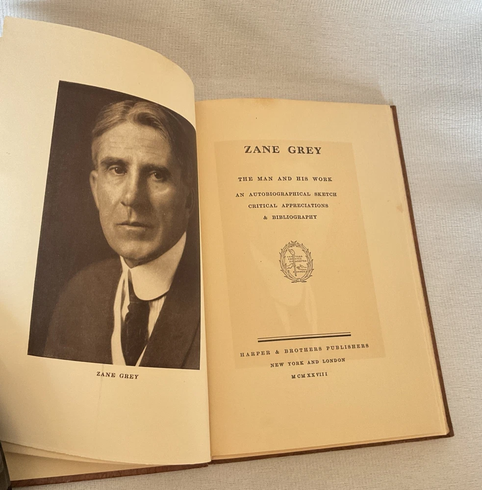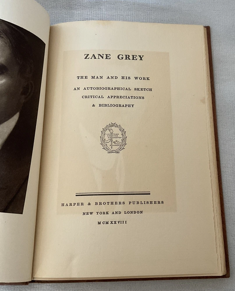 Zane Grey: The Man and His Work. An Autobiographical Sketch. Critical Appreciations & Bibliography - Signed by Loren Grey Title: Zane Grey: The Man and His Work. An Autobiographical Sketch. Critical Appreciations & Bibliography - Signed by Loren Grey Publication: New York: Harper and Brothers, 1928 Edition: First printing Description: First printing. Hardcover. Small 7.75 x 5.5 inches, stiff imitation leather covers, Signed by Grey's son Loren, name only. Book is in very good condition for it's age the title has faded on the book cover - see photos, there is a slight crease on the opening page - pictured across from name only, foxing on title and picture pages on edges - see photos, bottom corner bends in - see photo Please review photos as what is shown is what you are receiving - this is from an estate - All Sales Are Final