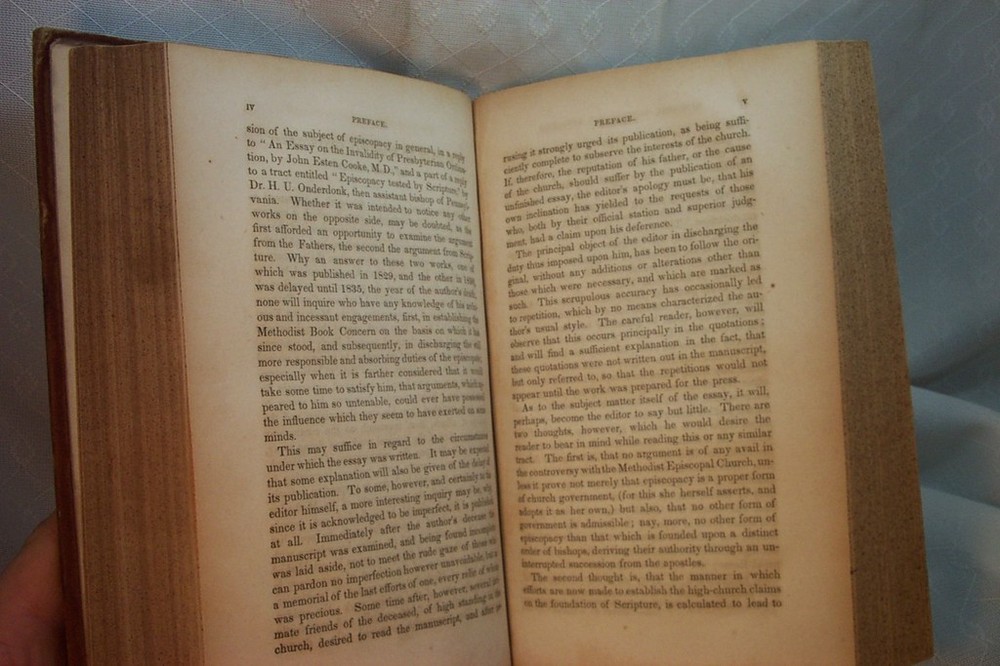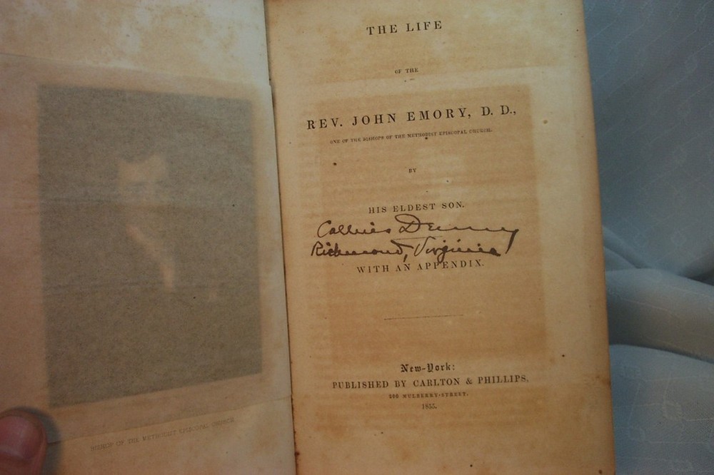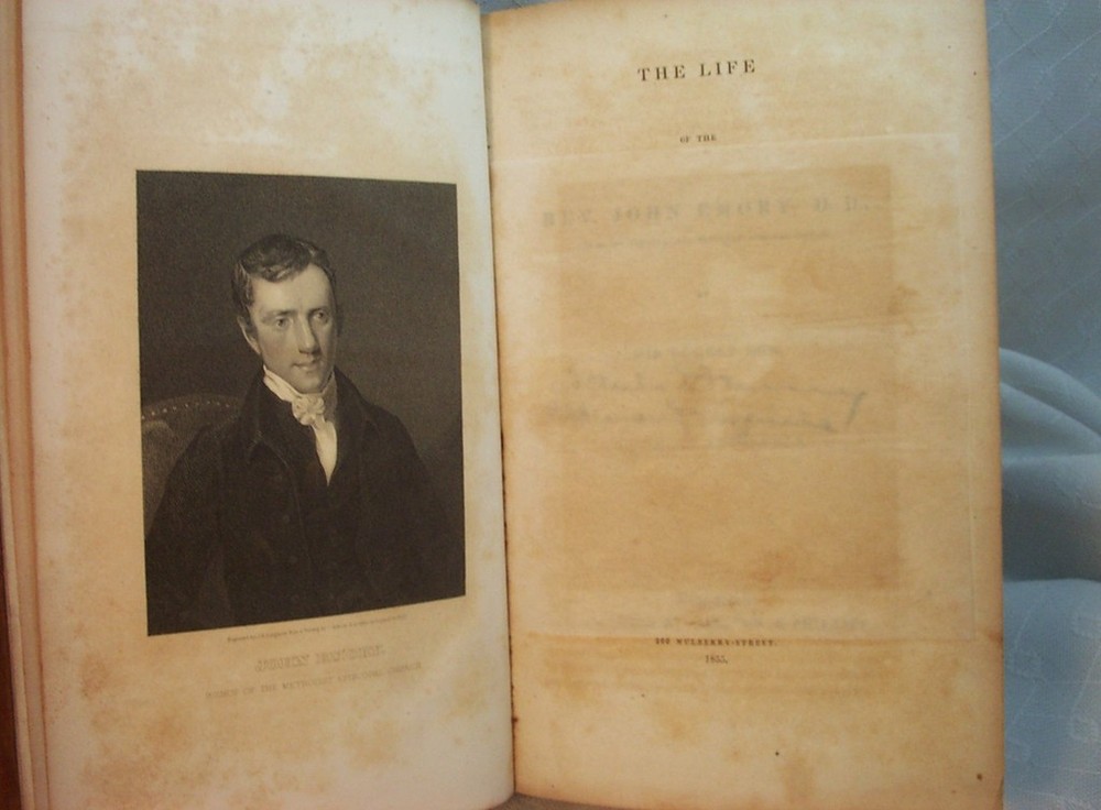 Rare antique book. THE LIFE OF REV JOHN EMORY BISHOP METHODIST EPISCOPAL CHURCH ANTIQUE OLD BOOK book includes Three books in one. THE LIFE OF THE REV JOHN EMORY D.D One of the BISHOPs of the METHODIST EPISCOPAL CHURCH . by His Eldest Son. with an appendix. published by Carlton & Phillips 200 Mulberry street New York, 1855. entered according to act of Congress in the year 1841, by George Lane. 380 pages THE EPISCOPAL CONTROVERSY REVIEWED by JOHN EMORY., Edited by his son, from an unfinished manuscript. Published by G. Lane & c.b. Tippett. 1845. 183 pages. A DEFENCE OF "OUR FATHERS" and of the Original Organization of THE METHODIST EPISCOPAL CHURCH, Against THE REV. ALEXANDER M'CAINE and others: With Historical and Critical Notices of Early American Methodism. by JOHN EMORY. published by Carlton & Phillips, 1856. 154 pages. also some advertising pages for other books in back pages are in mostly very good condition, with some yellowing/tanning,mostly around margin areas. a few pages are age toned quite a bit, maybe a different type of paper ? frontispiece illustration/title page have lot of yellowing, spots. other pages some spots here and there. a few notations,markings in text. a previous owners signature on title page and on endpaper with inscription " Collins ? Colliers ? Dewey ? bought in New York second hand. May 15, 1928 Paid .15c" looks like there might be a page missing between the index of Life of Bishop Emory and the title page of The Episcopal controvery. The last entry of the index is Wesleyan Repository, I dont know if there was another index page or maybe an illustration or blank page beginning the next. there is the remains of a piece of paper, like one was torn out ??Leather cover in POOR CONDITION, front and back covers are dettached. leather has scuffing/scratches/worn/wear. John Emory (11 April 1789 ā 1835) was an American Bishop of the Methodist Episcopal Church, elected in 1832 John was born at Spaniard's Neck, Queen Annes's County, Maryland. His parents were Methodists, his father a jurist who designed him for the law. His mother, however, who had been converted under Garrettson, devoted John at birth to the ministry. His eldest son Robert, born in 1814, became a professor of Latin and Greek at Dickinson College in 1836 and later its president. In 1841 he published a biography of his father, Life of the Rev. John Emory . He was educated by tutors at Easton, and Lancaster, Pennsylvania, and in Washington College, Chestertown, Maryland. He experienced "saving grace" at a Quarterly Meeting in 1806. He studied law in 1805 in the office of Judge R.T. Earle,Centreville, Maryland, and was admitted to the bar in 1808. But his attention soon turned to the pulpit, against his father's protests, and he entered the Traveling Ministry of the Philadelphia Annual Conference of the M.E. Church in 1810. Emory became well known, and his services were much in demand throughout the Middle States. He was elected a Member of the General Conference of 1816, and then to each succeeding General Conference (with one exception) through 1832 (when he was elected to the Episcopacy). He was sent as a delegate to the British Wesleyan conference in 1820. He was appointed Book Agent and Editor for the M.E. Church in 1824, with offices in New York City. While a bishop, he continued his interest in the Book Concern, and during his management thereof was successful in paying-off all its debts, returning it to a solid foundation. Emory United Methodist Church in New Oxford, PA, erected in 1887, was named for him after he helped to establish the Emory Sunday School during the church's early years - between 1832 and 1835. pantry