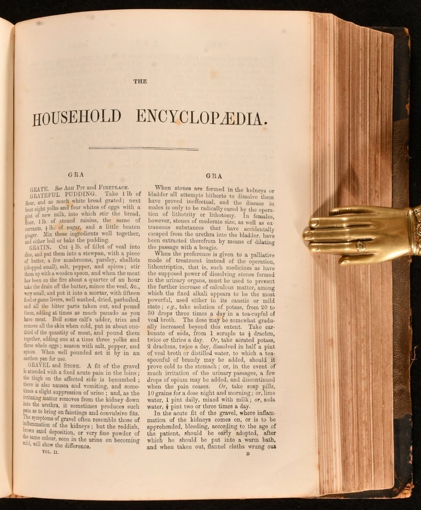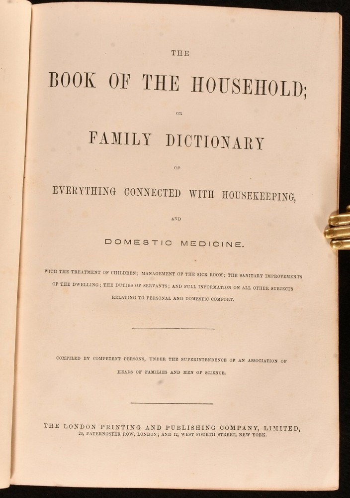 Click here to see our other books! The Book of the Household; or Family Dictionary of Everything connected with Housekeeping and Domestic Medicine Various c1870 The London Printing and Publishing Company : London 10" by 7" 576; 576pp SUMMARY An extensive dictionary and reference work for household management, two volumes bound in one. Illustrated,Leather Binding Overall Condition: Good This book weighs 5 KG when packed UK Postage: £ 4.49 US Postage: £ 42.99 EU Postage : £ 27.99 European Postage: £ 45.99 Asia Postage: £ 74.99 Worldwide Postage: £ 129.99 DESCRIPTION Complete two volumes bound in one. The Book of the Household; or Family Dictionary of Everything connected with Housekeeping and Domestic Medicine also contains the treatment of children, management of the sick room and subjects relating to personal and domestic comfort. The work is organised in alphabetical order. With eleven plates to the first volume and nine to volume two. Collated, complete. CONDITION In half calf binding. Externally, smart with some rubbing to the spine and extremities and some marks to the boards. Rear hinge is starting but remains firm. Internally, firmly bound with bright and generally clean pages. Overall Condition: Good GLOSSARY OF TERMS Overall Condition (Dustwrapper condition rating is shown after that for the book itself, where a dustwrapper is present) Fine - Very well preserved copy showing very little wear Very Good Indeed - Only one or two minor faults, really a very attractive copy Very Good - Quite a wide term meaning no major faults but probably several smaller ones often expected given the age of the book, but still a respectable copy Good - Meaning not very good. Some more serious faults as will be described in the condition report under 'condition' Good Only - Meaning one or more faults that could really do with repair Fair - As with good only above but with other faults leaving a compromised copy even after repair Poor - Really bad and possibly seriously incomplete. We only sell books in this condition where their rarity or value makes them attractive none the less. Major defects will be described. GUARANTEE We offer a full money back guarantee on our descriptions. Please ask for details and conditions. We prefer PAYPAL. If you pay via PAYPAL we will post the item off the same or the next working day with the postage you have selected. Please note we cannot accept USD cheques