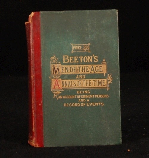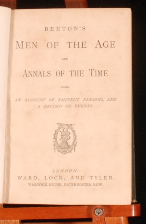 Click here to see our other books! Beeton's Men of the Age and Annals of the Time Samuel Orchart Beeton c1874 Ward, Lock and Tyler : None 7" by 4.5" ii, 238pp; 14pp SUMMARY A scarce copy of Beeton's work on the most famous men and women of his time. Leather Binding,Scarce Overall Condition: Good This book weighs 0.75 KG when packed UK Postage: £ 3.99 US Postage: £ 19.99 EU Postage : £ 15.99 European Postage: £ 16.99 Asia Postage: £ 21.99 Worldwide Postage: £ 25.99 DESCRIPTION With a publisher's catalogue to the rear. With the bookseller's label of Veuve J. Boyveau, Librairie Etrangere, to the front pastedown. Samuel Orchart Beeton (2 March 1831–6 June 1877) was an English publisher, best known as the husband of Mrs Beeton and publisher of Mrs Beeton's Book of Household Management. Beeton launched The English Woman's Domestic Magazine, a pioneering serial for middle-class women, in 1852. His Boy's Own Magazine, published in the UK from 1855 to 1890, was the first magazine for boys. Mrs Beeton's Book of Household Management was published in 1861. Beeton followed it with a series of other self-help textbooks, including Beeton's Book of Needlework, Beeton's Dictionary of Geography, Beeton's Book of Birds, and Beeton's Book of Anecdote, Wit and Humour. CONDITION In a half leather binding with cloth covered boards. Externally, rubbed. Loss to the top of the spine. Hinges slightly strained. Internally, generally firmly bound although slightly strained in places with one page working loose. Generally clean with some just some occasional spotting. Tide marks to lower edge of front pastedown and front free endpaper. Overall Condition: Good GLOSSARY OF TERMS Overall Condition (Dustwrapper condition rating is shown after that for the book itself, where a dustwrapper is present) Fine - Very well preserved copy showing very little wear Very Good Indeed - Only one or two minor faults, really a very attractive copy Very Good - Quite a wide term meaning no major faults but probably several smaller ones often expected given the age of the book, but still a respectable copy Good - Meaning not very good. Some more serious faults as will be described in the condition report under 'condition' Good Only - Meaning one or more faults that could really do with repair Fair - As with good only above but with other faults leaving a compromised copy even after repair Poor - Really bad and possibly seriously incomplete. We only sell books in this condition where their rarity or value makes them attractive none the less. Major defects will be described. GUARANTEE We offer a full money back guarantee on our descriptions. Please ask for details and conditions. We prefer PAYPAL. If you pay via PAYPAL we will post the item off the same or the next working day with the postage you have selected. Please note we cannot accept USD cheques