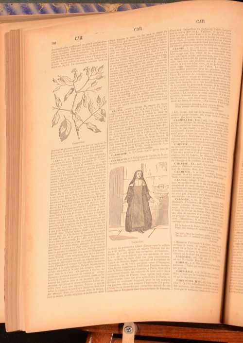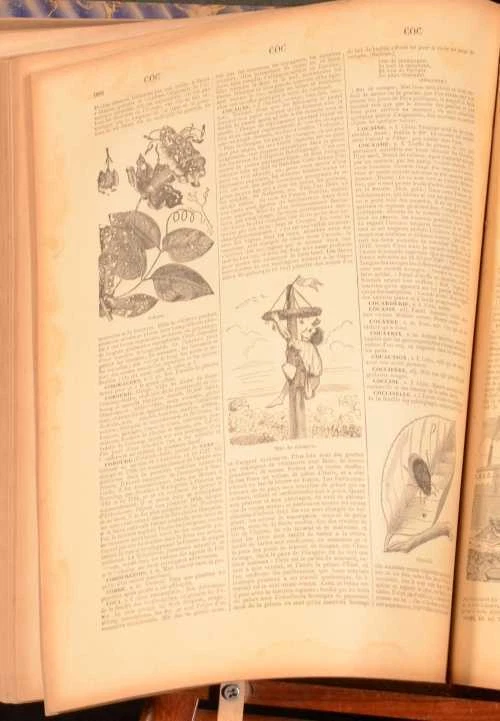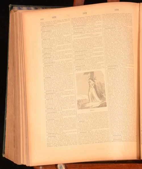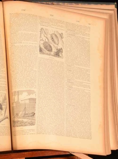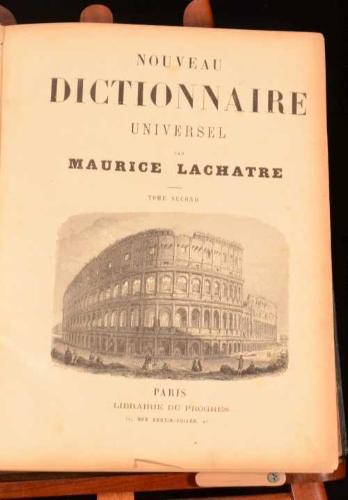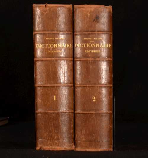 Click here to see our other books! Nouveau Dictionnaire Universel Maurice Lachatre c1880 Librairie du Progres : Paris 12.5" by 9.5" 1630; 1582pp SUMMARY A charming, illustrated two volume French dictionary bound in half calf. Illustrated,Leather Binding Overall Condition: Good This book weighs 1 KG when packed UK Postage: £ 3.99 US Postage: £ 22.99 EU Postage : £ 16.99 European Postage: £ 17.99 Asia Postage: £ 22.99 Worldwide Postage: £ 28.99 DESCRIPTION With illustrations in the text throughout. Complete in two volumes. Maurice Lachatre is the pen name of Maurice de la Chatre, a French editor (1814-1900). He compiled the Universal Dictionary between 1852 and 1856, with Volume I published in 1865 and Volume II published in 1870. CONDITION In a quarter calf bindings with cloth covered boards. Externally, sound, rubbed in places. Sunning to the spines. Three hinges strained and one hinge slightly strained. Internally, generally firmly bound although the first and last few pages of volume I are detached but present or working loose. Age toning and some scattered light foxing. Some creasing to the endpapers. Overall Condition: Good GLOSSARY OF TERMS Overall Condition (Dustwrapper condition rating is shown after that for the book itself, where a dustwrapper is present) Fine - Very well preserved copy showing very little wear Very Good Indeed - Only one or two minor faults, really a very attractive copy Very Good - Quite a wide term meaning no major faults but probably several smaller ones often expected given the age of the book, but still a respectable copy Good - Meaning not very good. Some more serious faults as will be described in the condition report under 'condition' Good Only - Meaning one or more faults that could really do with repair Fair - As with good only above but with other faults leaving a compromised copy even after repair Poor - Really bad and possibly seriously incomplete. We only sell books in this condition where their rarity or value makes them attractive none the less. Major defects will be described. GUARANTEE We offer a full money back guarantee on our descriptions. Please ask for details and conditions. We prefer PAYPAL. If you pay via PAYPAL we will post the item off the same or the next working day with the postage you have selected. Please note we cannot accept USD cheques