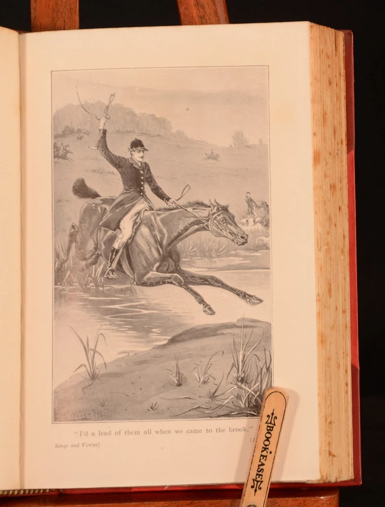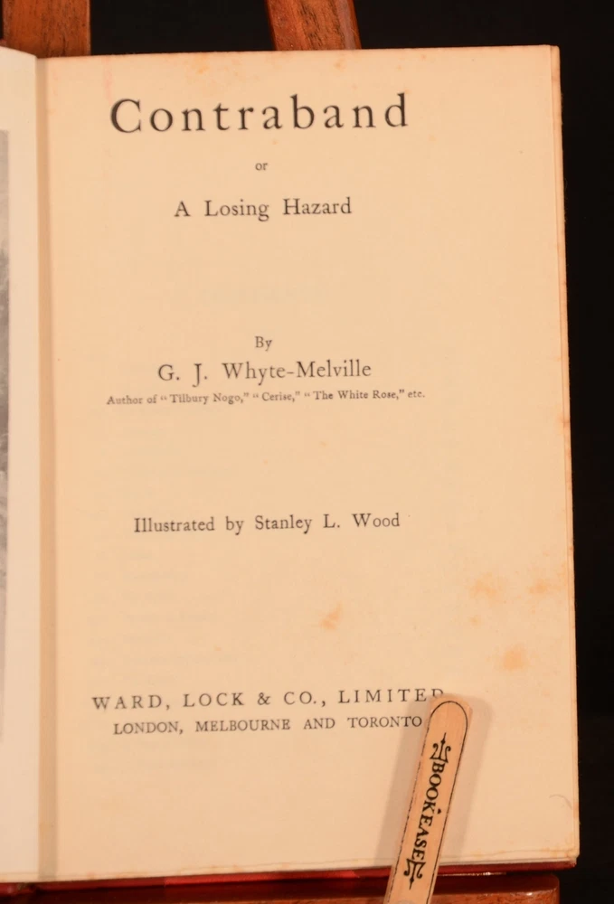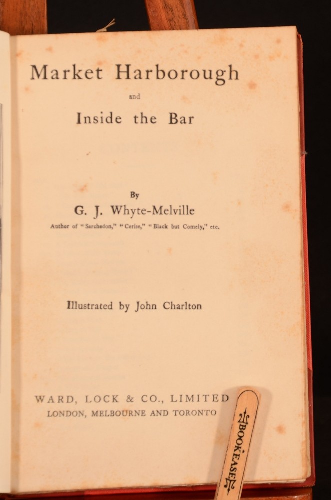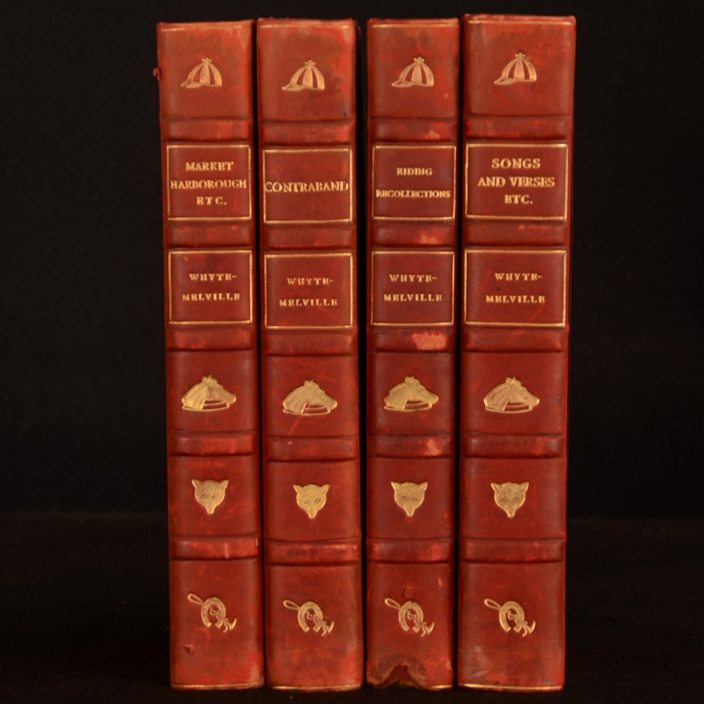 Click here to see our other books! The Works of Whyte-Melville Songs and Verses and The True Cross Riding Recollections Contraband or A Losing Hazard Market Harborough and Inside the Bar G. J. Whyte-Melville c1890 Ward, Lock & Co. : London 8" by 5.5" 356pp; 248pp; 300pp; SUMMARY A four volume set of works by the notable Scottish novelist and poet, George John Whyte-Melville. Illustrated,Leather Binding Overall Condition: Very Good This book weighs 2 KG when packed UK Postage: £ 3.99 US Postage: £ 29.99 EU Postage : £ 21.99 European Postage: £ 23.99 Asia Postage: £ 37.99 Worldwide Postage: £ 38.99 DESCRIPTION Containing the following works: 'Songs and Verses and The True Cross' 'Riding Recollections' 'Contraband or A Losing Hazard' 'Market Harborough and Inside the Bar' Featuring a bookplate of a 'Samuel Leslie Williams' to the front pastedown of 'Market Harborough'. In a uniform quarter polished calf binding with cloth boards and attractive marbled endpapers. Collated, presumed complete, with illustrations by John Charlton, Stanley L. Wood, and Samuel Edmund Waller. All volumes are undated, dated using Copac. CONDITION In a uniform quarter polished calf binding with cloth boards. Externally slightly faded and rubbed to spines, resulting in loss of leather to tail of 'Riding Recollections'. Very slightly rubbed to extremities. Internally firmly bound. Pages very bright and clean, slightly age toned to edges with scattered spotting to textblock. Occasional scattered spotting to the fore edge of the odd page. Light scattered spotting to first and last few pages. Spotting from title page to to page 8, 'Market Harborough'. Prior owner's bookplate to front pastedown, 'Market Harborough'. Overall Condition: Very Good GLOSSARY OF TERMS Overall Condition (Dustwrapper condition rating is shown after that for the book itself, where a dustwrapper is present) Fine - Very well preserved copy showing very little wear Very Good Indeed - Only one or two minor faults, really a very attractive copy Very Good - Quite a wide term meaning no major faults but probably several smaller ones often expected given the age of the book, but still a respectable copy Good - Meaning not very good. Some more serious faults as will be described in the condition report under 'condition' Good Only - Meaning one or more faults that could really do with repair Fair - As with good only above but with other faults leaving a compromised copy even after repair Poor - Really bad and possibly seriously incomplete. We only sell books in this condition where their rarity or value makes them attractive none the less. Major defects will be described. GUARANTEE We offer a full money back guarantee on our descriptions. Please ask for details and conditions. We prefer PAYPAL. If you pay via PAYPAL we will post the item off the same or the next working day with the postage you have selected. Please note we cannot accept USD cheques