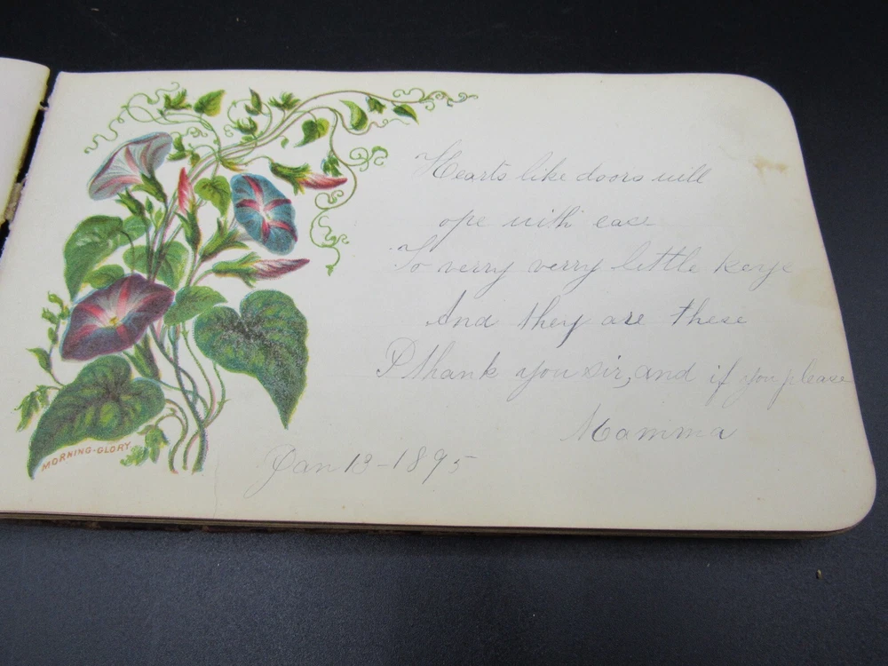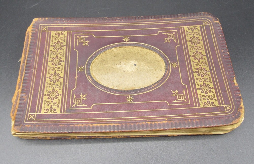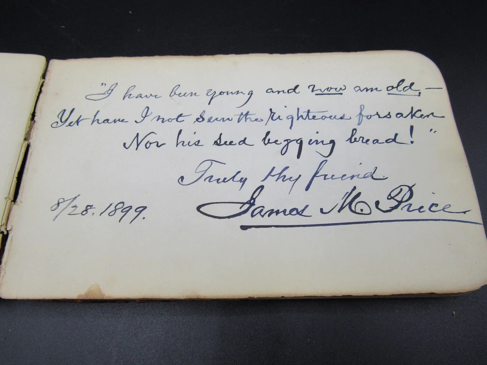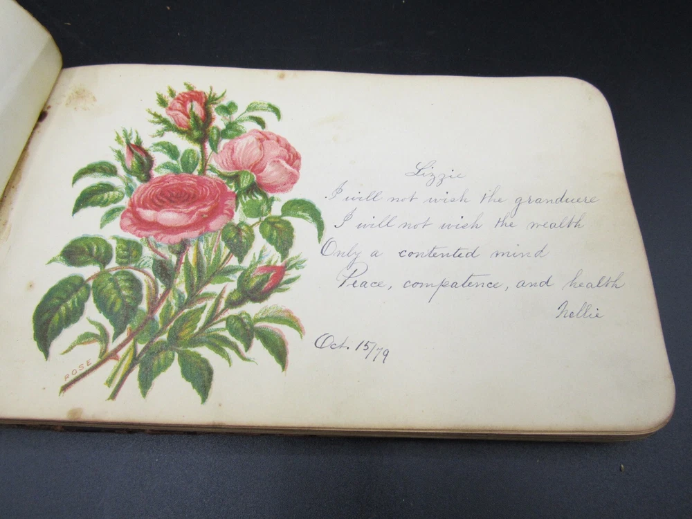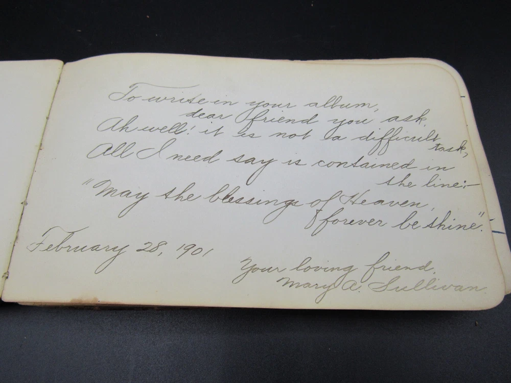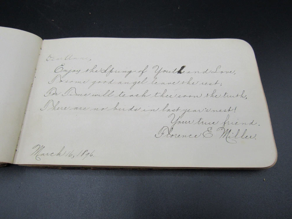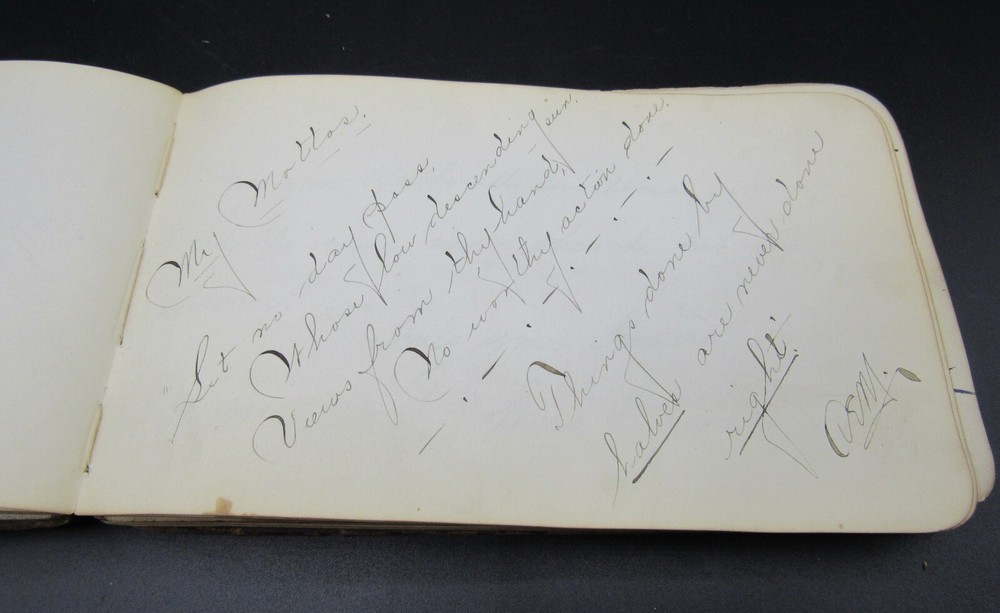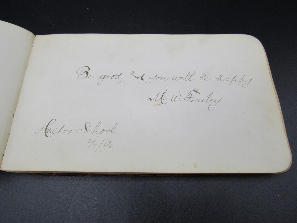 c.1900 Antique leather bound autograph book 4 1/4 ” x 6 3/4 ” , binding loose Signed by: Gordon Mary A. Sullivan Price Bessie Buckley Nellie Edwin Markham Lillian J. Mullen Elizabeth Kauffman Margaret Miller M. James Blanche E Mott Florence E Miller Blanche E Rowe M W Frailey Sophie Oppenheimer S.J. Fry S.E. Coundiss Margaret Moorhead Emma Frailey Carrie V Tewall Elizabeth Briston Janney Lizzie Bathcart Jesse George Campion Anna B Miller Fannie Cooper E M Cooper A E Hollis M Ray Mollie Wolff Minerva H Scheetz _gsrx_vers_1634 (GS 9.6 (1634))