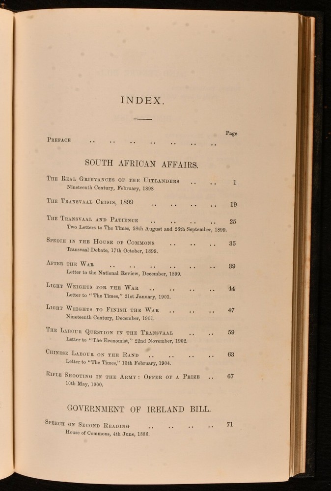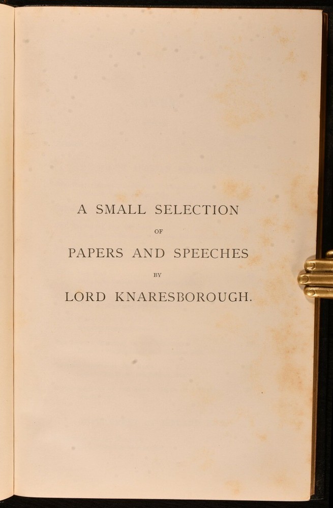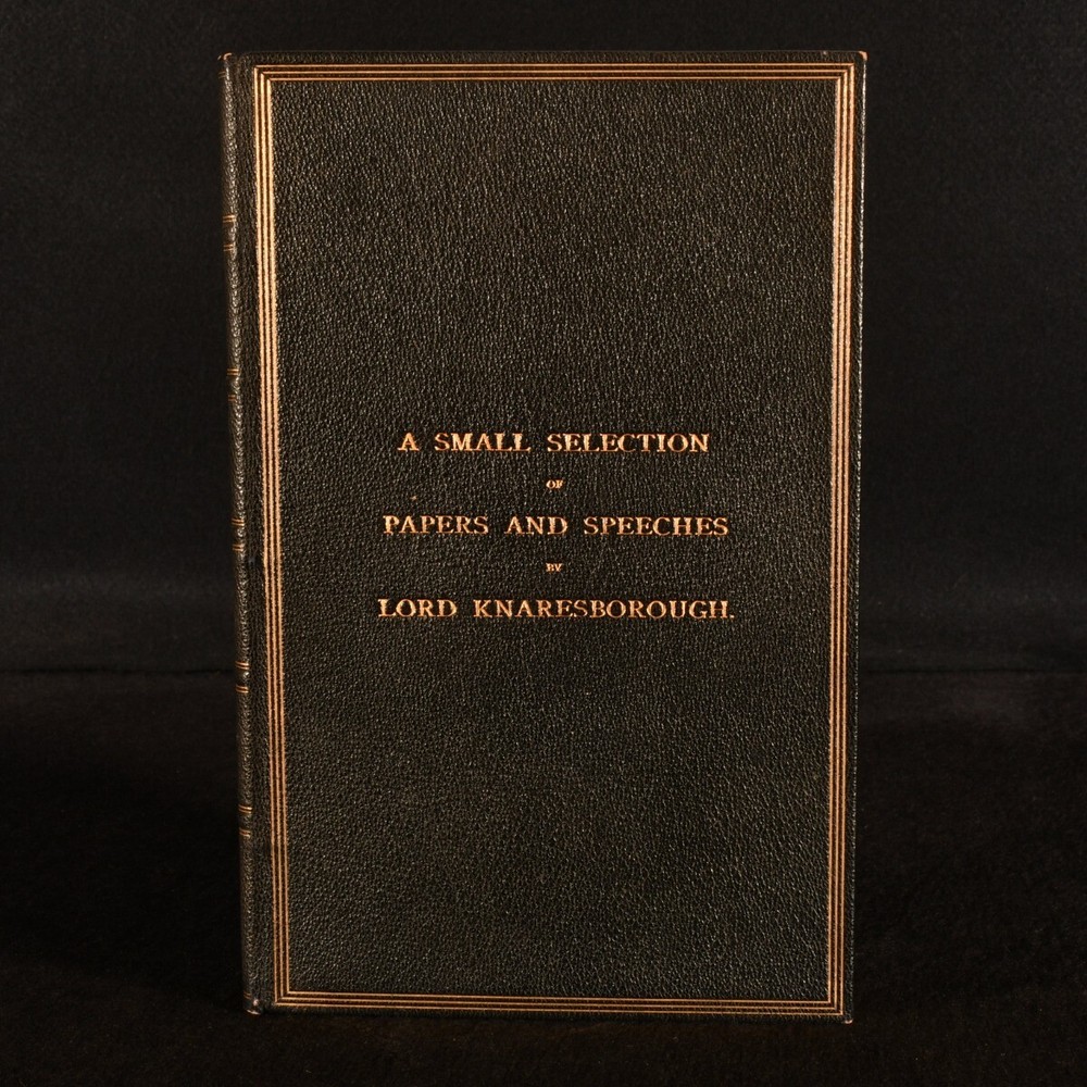 Click here to see our other books! A Small Selection of Papers and Speeches by Lord Knaresborough Henry Meysey Meysey-Thompson, 1st Baron Knaresborough 1908 Privately Printed : Not Stated 10" by 7" viii [3], 4-151pp SUMMARY A vanishingly scarce, privately printed, selection of speeches given by Henry Meysey-Thompson, 1st Baron Knaresborough, between 1886 and 1906. Leather Binding,Very Scarce Overall Condition: Very Good Indeed This book weighs 1 KG when packed UK Postage: £ 3.99 US Postage: £ 22.99 EU Postage : £ 16.99 European Postage: £ 17.99 Asia Postage: £ 22.99 Worldwide Postage: £ 28.99 DESCRIPTION A very scarce, privately published collection of speeches and papers by the Liberal politician. Henry Meysey-Thompson sat in the House of Commons between 1880 and 1905, at which point he was raised to the peerage as Baron Knaresborough. This collection of essays and speeches are arranged into sections devoted to the 'South African Affairs', 'Government of Ireland Bill', 'Land Tenure Bill', and 'Bimentalism'. Not recorded by Copac. With a pencil inscription to the verso of the title page. Meysey-Thompson provides a preface to the rear of the work. CONDITION In a full morocco binding. A touch of rubbing to back strip head and tail, otherwise externally fine. Spotting to endpapers. Pencil inscription to verso of front free endpaper. Internally, firmly bound. Pages exceptionally clean and bright. Overall Condition: Very Good Indeed GLOSSARY OF TERMS Overall Condition (Dustwrapper condition rating is shown after that for the book itself, where a dustwrapper is present) Fine - Very well preserved copy showing very little wear Very Good Indeed - Only one or two minor faults, really a very attractive copy Very Good - Quite a wide term meaning no major faults but probably several smaller ones often expected given the age of the book, but still a respectable copy Good - Meaning not very good. Some more serious faults as will be described in the condition report under 'condition' Good Only - Meaning one or more faults that could really do with repair Fair - As with good only above but with other faults leaving a compromised copy even after repair Poor - Really bad and possibly seriously incomplete. We only sell books in this condition where their rarity or value makes them attractive none the less. Major defects will be described. GUARANTEE We offer a full money back guarantee on our descriptions. Please ask for details and conditions. We prefer PAYPAL. If you pay via PAYPAL we will post the item off the same or the next working day with the postage you have selected. Please note we cannot accept USD cheques