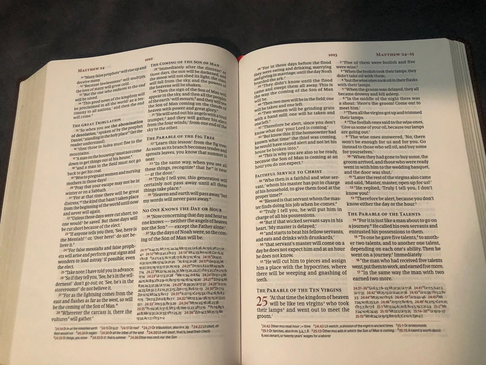 Item was as described, no marks or highlights in the txt which is what I wanted. He does great quality work on rebinding the Bible. I was searching for a NASB 95 life application Bible, but they are no longer in print and not many out there that doesn’t have mark free txt. Seller is up front regarding shipping. Bible was neatly packed. For what I was looking for this was a great value. Keep doing the Lords work!
