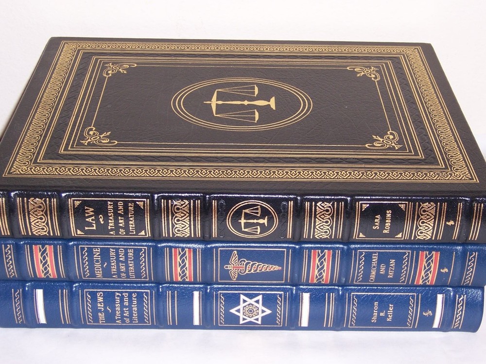 Books from Easton Press Bound in premium leathers, distinctive cover design, hubbed spine accented in 22-karat gold Endsheets of rich moire fabric, permanent satin ribbon page marker Thread sewn pages for strength and durability, gilded page edges for beauty and protection Handsome readable typefaces, beautiful illustrations, archival-quality acid-neutral paper TITLE A Treasury of Art and Literature in 3 vols AUTHOR various MORE DETAILS 1. MEDICINE -A Treasury of Art and Literature, edited by Ann G Cramichael and Richard M Ratzan, 376 pp 2. LAW -A Treasury of Art and Literature, edited by Sara Robbins, 376 pp 3. The Jews -A Treasury of Art and Literature, edited by Sharon R Keller, 384 pp measured by 10" x 13 1/4" DESCRIPTION Like new condition, unread, clean inside, tight hardcover binding SHIPPING Books will be packed safely, and shipped via USPS Media Mail with tracking number.