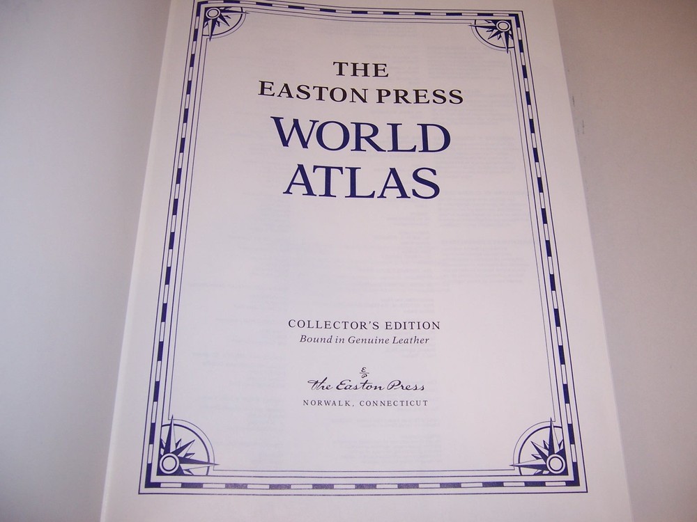 Books from Easton Press Bound in premium leathers, distinctive cover design, hubbed spine accented in 22-karat gold Endsheets of rich moire fabric, permanent satin ribbon page marker Thread sewn pages for strength and durability, gilded page edges for beauty and protection Handsome readable typefaces, beautiful illustrations, archival-quality acid-neutral paper TITLE THE WORLD ATLAS AUTHOR with Rand McNally & Company MORE DETAILS illustrated in full color measured by 11 1/4" x 15", 320 + 199pp DESCRIPTION Like new condition, unread, clean inside, tight hardcover binding SHIPPING Books will be packed safely, and shipped via USPS Media Mail with tracking number.