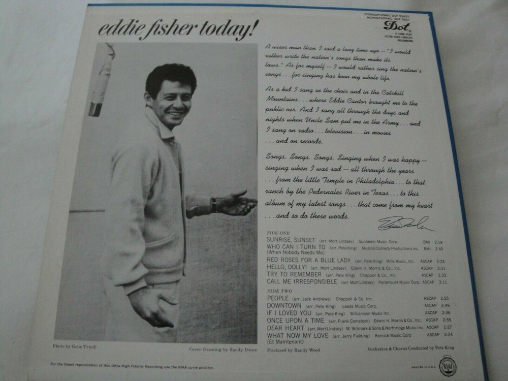 eddie fisher today! VINYL LP ALBUM DOT RECORDS WHO CAN I TURN TO, IF I LOVED YOU. EX ON VINYL AND COVER. THE RECORD LOOKS AND SOUNDS VERY GOOD. THE COVER HAS TIGHT SEAMS AND LOOKS VERY GOOD(SEE PHOTOS). OVERALL NICE ALBUM. ORIGINAL DOT RECORDS DLP 25631, STEREO. 27443 Listing and template services provided by inkFrog