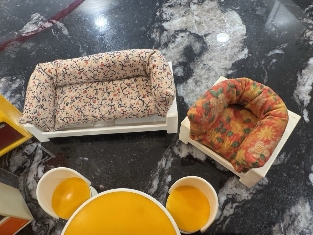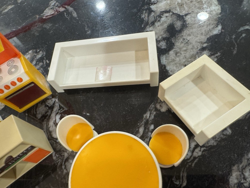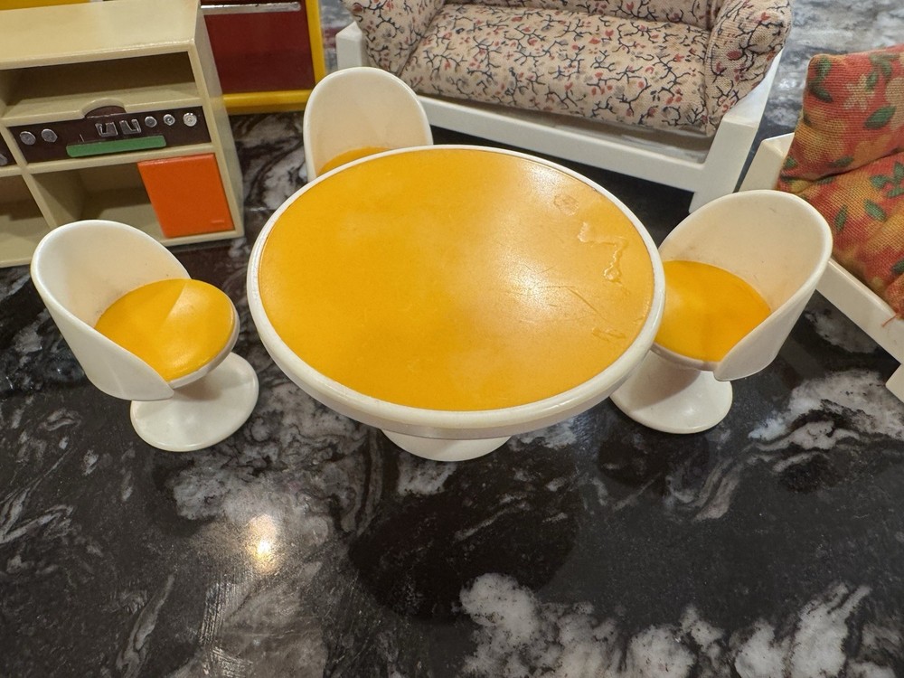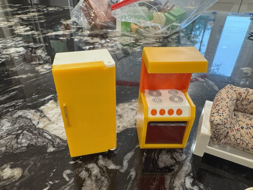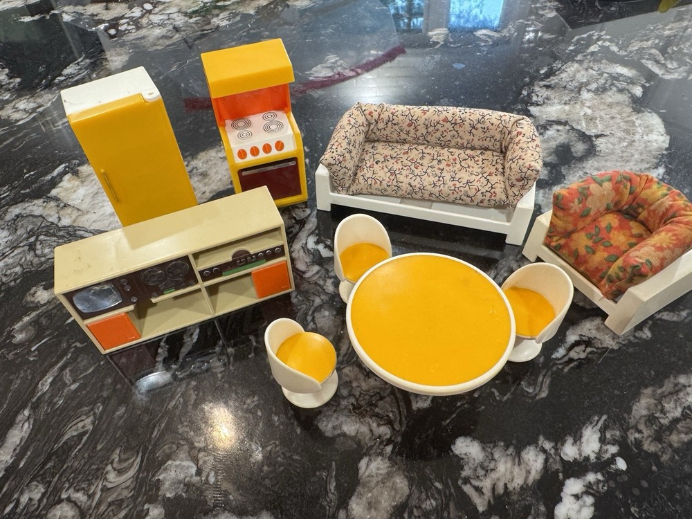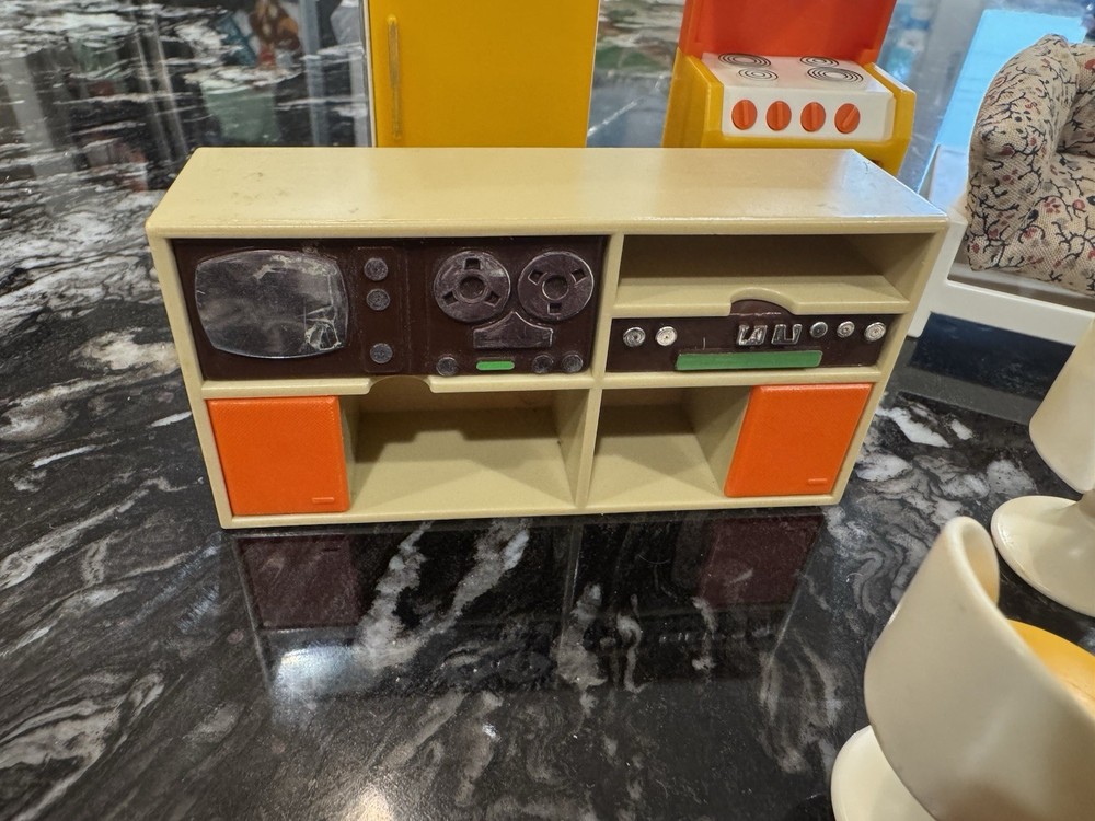 The product is a Fisher-Price Loving Family Retro modern dollhouse kitchen living room stereo lot. This set includes various rooms from a dollhouse, such as a kitchen and living room, along with a stereo for added playtime entertainment. As part of the Fisher-Price brand, this dollhouse set combines nostalgia with modern elements to create an engaging and interactive play experience for children.