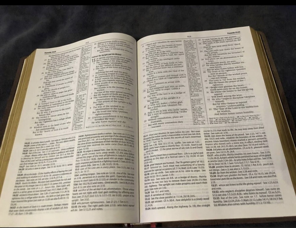 Item was as described, no marks or highlights in the txt which is what I wanted. He does great quality work on rebinding the Bible. I was searching for a NASB 95 life application Bible, but they are no longer in print and not many out there that doesn’t have mark free txt. Seller is up front regarding shipping. Bible was neatly packed. For what I was looking for this was a great value. Keep doing the Lords work!