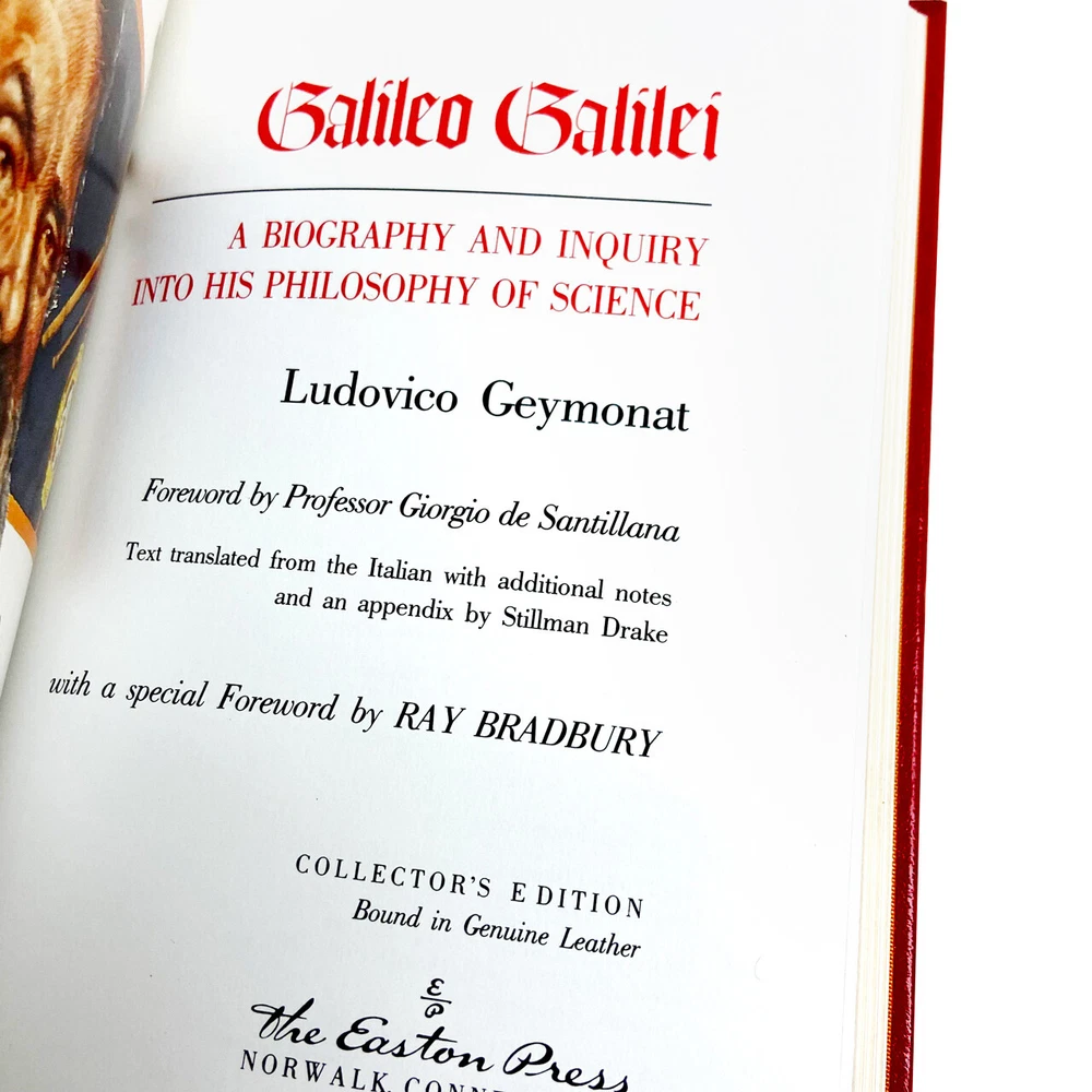 Easton Press, Norwalk CT. Ludovico Geymonat "Galileo Galilei: A Biography and Inquiry Into His Philosophy of Science". Full genuine leather. The library of great lives. Very Fine without any flaws. Forward by Professor Giorgio de Santillana Text translated from the Italian with additional notes and an appendix by Stillman Drake, with a special forward by Ray Bradbury. Galileo Galilei (15 February 1564 - 8 January 1642), often known mononymously as Galileo, was an Italian physicist, mathematician, engineer, astronomer, and philosopher who played a major role in the scientific revolution during the Renaissance. About the author Ludovico Geymonat (May 11, 1908 - November 29, 1991) was an Italian Marxist philosopher, who gave an original turn to dialectical materialism. Ludovico Geymonat teaches medieval art at LSU. His research has developed from doctoral studies on Byzantine and Romanesque wall painting to focus on medieval drawings, monumental programs, and the question of how images and ideas circulated in the Middle Ages. He is currently working on two book projects. The first focuses on wall paintings in the Baptistery of Parma, Italy, and the second, Monumental Decorations and the Medieval Perception of Space, investigates how ideas are translated into visual representations on a monumental scale. Before joining the art history faculty at LSU in 2017, Geymonat was a visiting professor at the University of Notre Dame. He has published on 13th- and 14th-century Venetian painting and sculpture, the Baptistery of Parma, and medieval drawings. His teaching covers the history of medieval art and architecture in Europe and the Mediterranean. Geymonat received his BA in art history from the Universitá di Torino in Turin, Italy, and his MA and PhD in art history from Princeton University. Features Includes all the classic Easton Press qualities: * Premium Leather * Silk Moire Endleaves * Distinctive Cover Design * Hubbed Spine, Accented in Real 22KT Gold * Satin Ribbon Page Marker * Gilded Page Edges * Long-lasting, High Quality Acid-neutral Paper * Smyth-sewn Pages for Strength and Durability * Beautiful Illustrations Galileo Galilei Galileo di Vincenzo Bonaiuti de' Galilei (15 February 1564 – 8 January 1642), commonly referred to as Galileo, was an Italian astronomer, physicist and engineer, sometimes described as a polymath, from the city of Pisa, then part of the Duchy of Florence.[4] Galileo has been called the "father" of observational astronomy, modern physics, the scientific method, and modern science. Galileo studied speed and velocity, gravity and free fall, the principle of relativity, inertia, projectile motion and also worked in applied science and technology, describing the properties of pendulums and "hydrostatic balances". He invented the thermoscope and various military compasses, and used the telescope for scientific observations of celestial objects. His contributions to observational astronomy include telescopic confirmation of the phases of Venus, observation of the four largest satellites of Jupiter, observation of Saturn's rings, and analysis of lunar craters and sunspots. Galileo's championing of Copernican heliocentrism (Earth rotating daily and revolving around the sun) was met with opposition from within the Catholic Church and from some astronomers. The matter was investigated by the Roman Inquisition in 1615, which concluded that heliocentrism was foolish, absurd, and heretical since it contradicted Holy Scripture. Galileo later defended his views in Dialogue Concerning the Two Chief World Systems (1632), which appeared to attack Pope Urban VIII and thus alienated both the Pope and the Jesuits, who had both supported Galileo up until this point. He was tried by the Inquisition, found "vehemently suspect of heresy", and forced to recant. He spent the rest of his life under house arrest. During this time, he wrote Two New Sciences (1638), primarily concerning kinematics and the strength of materials, summarizing work he had done around forty years earlier.