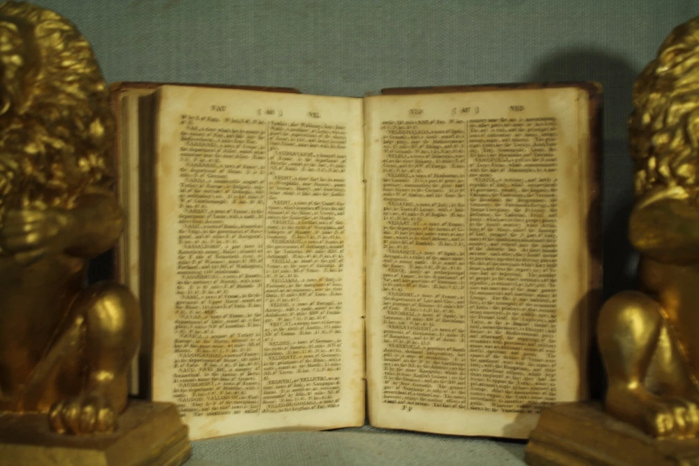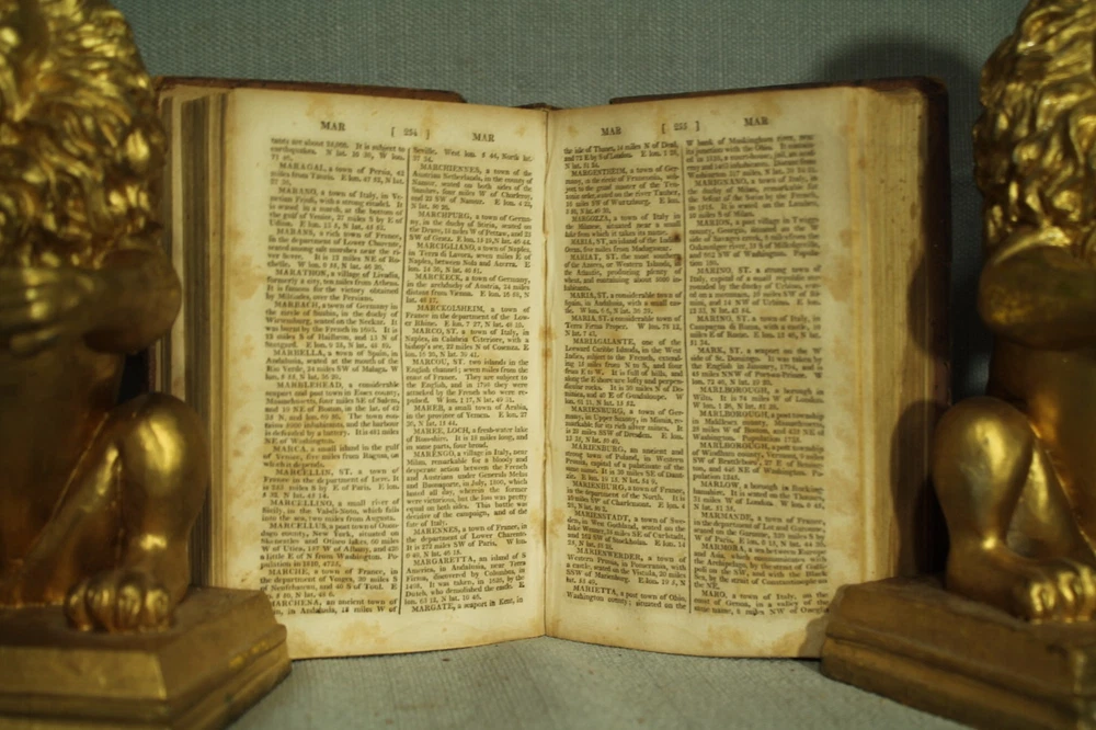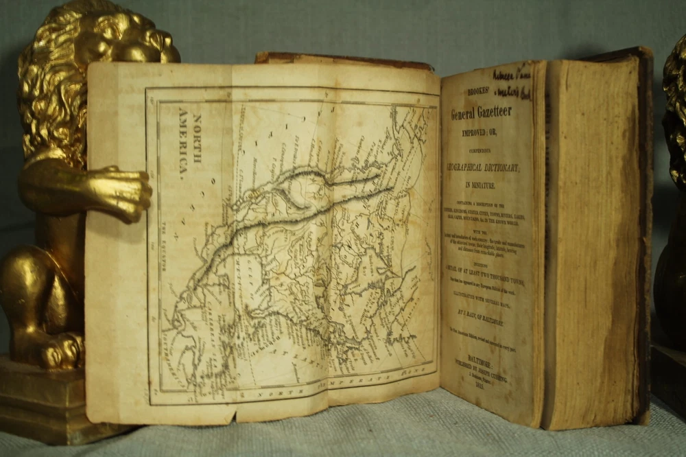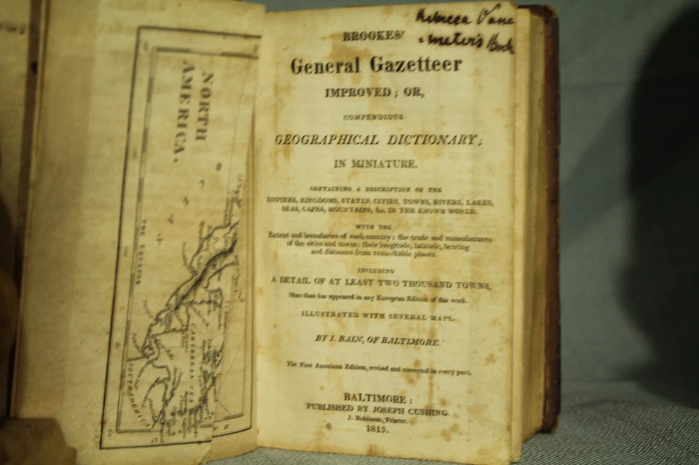 rare antique book over 200 years old. Brookes General Gazetteer Geography dictionary 1815 maps Brookes' General Gazetteer improved; or, compendious Geographical Dictionary; in Miniature. containing a description of the Empires, Kingdoms, States, Cities, Towns, Rivers, Lakes, Seas, Capes, Mountains, &c in the known world. with the Extent and boundaries of each country; the trade and manufactures of the cities and towns; their longitude, latitude, bearing and distances from remarkable places. including A Detail of at Least Two Thousand Towns, more than has appeared in any European Edition of this work. illustrated with several maps. by J Bain, of Baltimore. The First American edition published by Joseph Cushing, J. Robinson, Printer, Baltimore, 1815 500 pages. book measures 6" tall. original owner's signature Jacob Van Meter, , other names Rebecca Van Meter, Garrett S. Van Meter, Mansfield, Illinois. Location: built in second section Add a map to your own listings. FREE Trial! Track Page Views With Auctiva's FREE Counter