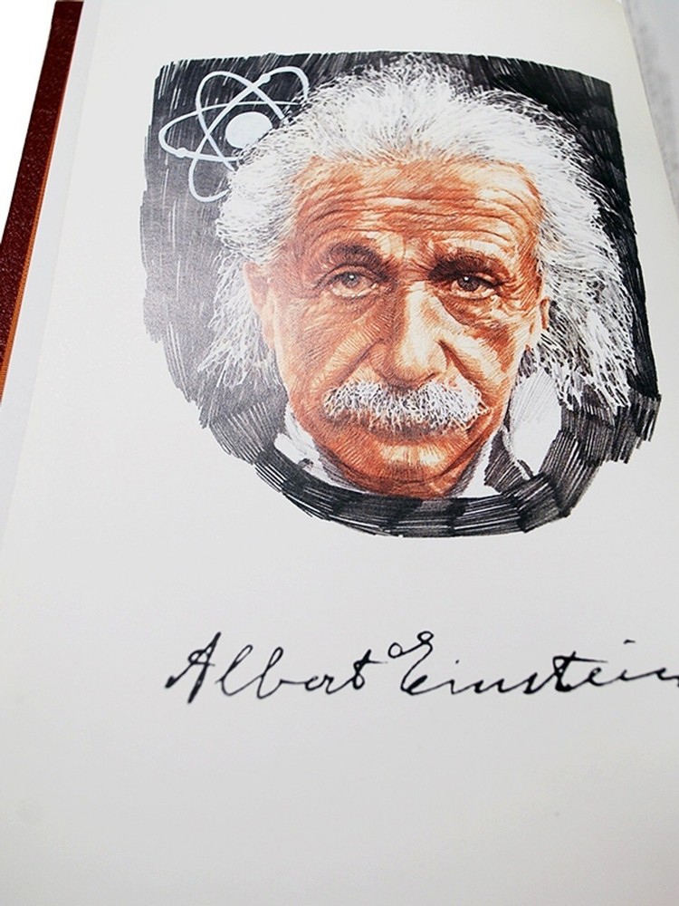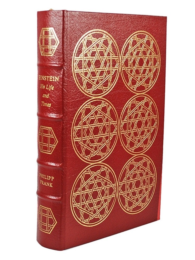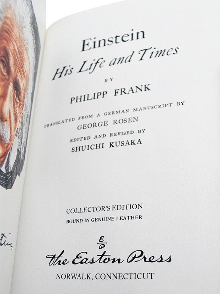 Thank you for visiting Find more great books in our Easton Press Library Easton Press, Norwalk, CT. 1998 First Edtiion. "Einstein: His Life and Times" by Philipp Frank. Hardcover. Luxuriously bound with full genuine leather and printed on archival paper with gilded edges. The endsheets are of moire fabric with a silk ribbon page marker. Collector's Edition that also includes the original publisher issued Note Card. The Library of Great Lives Translated from a German manuscript by George Rosen Edited and revised by Shuichi Kusaka Much has been written about Albert Einstein, technical and biographical, but very little remains as valuable as this unique hybrid of a book written by Einstein's colleague and contemporary. Both rich in personal insights and grounded in a deep knowledge of twentieth-century science, Phillip Frank's biography anchors the reader with a lucid overview of physics and draws an intimate portrait of the Nobel Prize winner. About the author In 1912, Philipp Frank became Einstein's successor at the University of Prague. In 1938, he came to the U.S., where he taught at Harvard. He died in Cambridge, Massachusetts, in 1966. Features Includes all the classic Easton Press qualities: * Premium Leather * Silk Moire Endleaves * Distinctive Cover Design * Hubbed Spine, Accented in Real 22KT Gold * Satin Ribbon Page Marker * Gilded Page Edges * Long-lasting, High Quality Acid-neutral Paper * Smyth-sewn Pages for Strength and Durability * Beautiful Illustrations About Albert Einstein Albert Einstein ( 14 March 1879 – 18 April 1955) was a German-born theoretical physicist, widely acknowledged to be one of the greatest and most influential physicists of all time. Einstein is best known for developing the theory of relativity, but he also made important contributions to the development of the theory of quantum mechanics. Relativity and quantum mechanics are together the two pillars of modern physics. His mass–energy equivalence formula E = mc2, which arises from relativity theory, has been dubbed "the world's most famous equation".[9] His work is also known for its influence on the philosophy of science. He received the 1921 Nobel Prize in Physics "for his services to theoretical physics, and especially for his discovery of the law of the photoelectric effect", a pivotal step in the development of quantum theory. His intellectual achievements and originality resulted in "Einstein" becoming synonymous with "genius". In 1905, a year sometimes described as his annus mirabilis ('miracle year'), Einstein published four groundbreaking papers. These outlined the theory of the photoelectric effect, explained Brownian motion, introduced special relativity, and demonstrated mass-energy equivalence. Einstein thought that the laws of classical mechanics could no longer be reconciled with those of the electromagnetic field, which led him to develop his special theory of relativity. He then extended the theory to gravitational fields; he published a paper on general relativity in 1916, introducing his theory of gravitation. In 1917, he applied the general theory of relativity to model the structure of the universe. He continued to deal with problems of statistical mechanics and quantum theory, which led to his explanations of particle theory and the motion of molecules. He also investigated the thermal properties of light and the quantum theory of radiation, which laid the foundation of the photon theory of light. However, for much of the later part of his career, he worked on two ultimately unsuccessful endeavors. First, despite his great contributions to quantum mechanics, he opposed what it evolved into, objecting that "God does not play dice". Second, he attempted to devise a unified field theory by generalizing his geometric theory of gravitation to include electromagnetism. As a result, he became increasingly isolated from the mainstream of modern physics. Einstein was born in the German Empire, but moved to Switzerland in 1895, forsaking his German citizenship (as a subject of the Kingdom of Württemberg) the following year. In 1897, at the age of 17, he enrolled in the mathematics and physics teaching diploma program at the Swiss Federal polytechnic school in Zürich, graduating in 1900. In 1901, he acquired Swiss citizenship, which he kept for the rest of his life, and in 1903 he secured a permanent position at the Swiss Patent Office in Bern. In 1905, he was awarded a PhD by the University of Zurich. In 1914, Einstein moved to Berlin in order to join the Prussian Academy of Sciences and the Humboldt University of Berlin. In 1917, Einstein became director of the Kaiser Wilhelm Institute for Physics; he also became a German citizen again, this time Prussian. In 1933, while Einstein was visiting the United States, Adolf Hitler came to power in Germany. Einstein, as Jewish, objected to the policies of the newly elected Nazi government;[18] he settled in the United States and became an American citizen in 1940.[19] On the eve of World War II, he endorsed a letter to President Franklin D. Roosevelt alerting him to the potential German nuclear weapons program and recommending that the US begin similar research. Einstein supported the Allies but generally denounced the idea of nuclear weapons.[20] Thank you for visiting Find more great books in our Easton Press Library