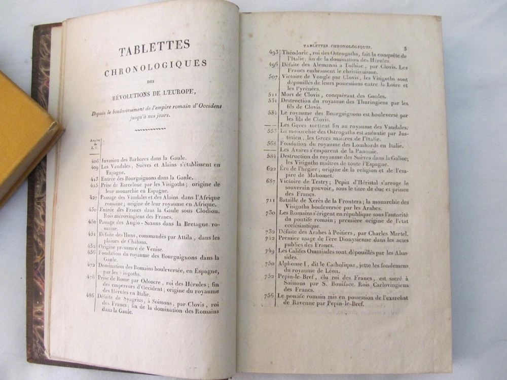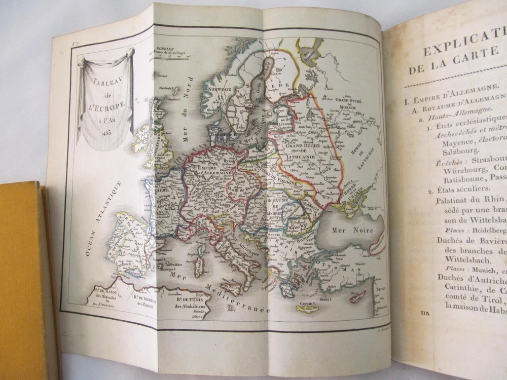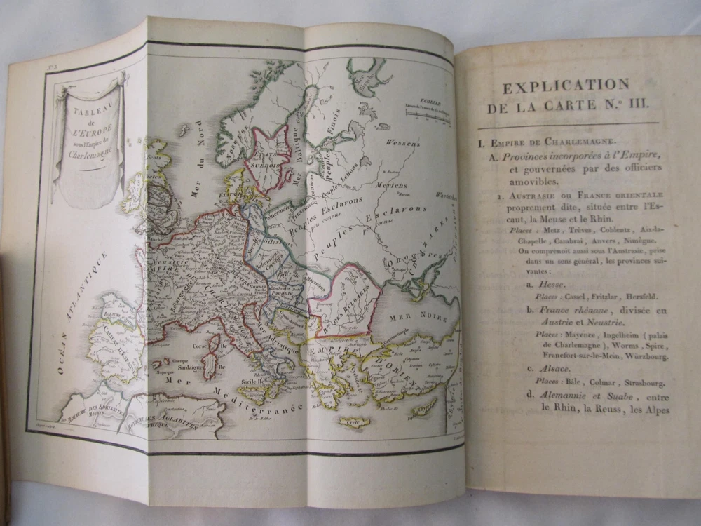 “Tableau des Revolutions de Europe, Depuis le Bouleversement, de l'Empire Romain en Occident Jusqu'a nos Jours" (Volume 3 of 4 only) by M. Koch. Published by Gide Fils, Paris (1814). The title of this vintage book translates as "Chart of the Revolutions of Europe, Since the Upheaval, of the Roman Empire in the West Until The Present". This book is over two hundred years old and in terrific, clean condition. The maps fold out and the original color is unfaded.