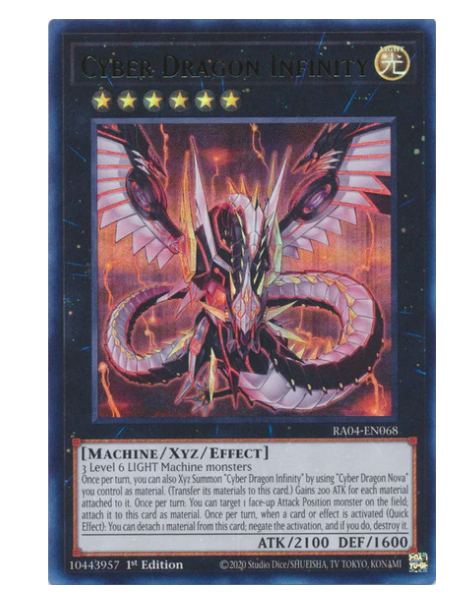 Absolutely thrilled with these Cyber Dragon Infinity cards! The Ultra Rare stamping looks amazing, and all three copies arrived in perfect near-mint condition—just as described. Shipping was super fast, and the seller was transparent about possible minor factory flaws, which were barely noticeable. Great value for the price, especially with the option for tracked shipping. Highly recommend for any Yu-Gi-Oh! collector or duelist looking to boost their deck!