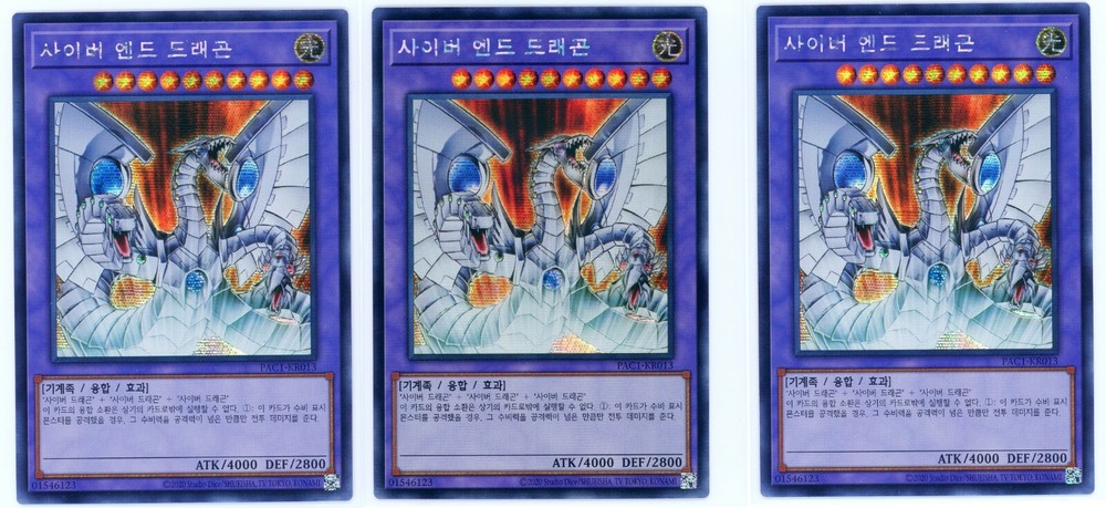 This lot includes (3) three separate copies of Cyber End Dragon PAC1-KR013 Secret Rare (a) The card is pack fresh and was immediately put into a sleeve and top loader. For shipping: cards will be placed in a Card Saver 1, put into a team bag with a piece of cardboard for added stability, then inserted into a double envelope. I will tape all of the edges of the envelope to prevent ripping and water damage. I use USPS eBay Trading Card shipping with a tracking number that will be provided to you through eBay.