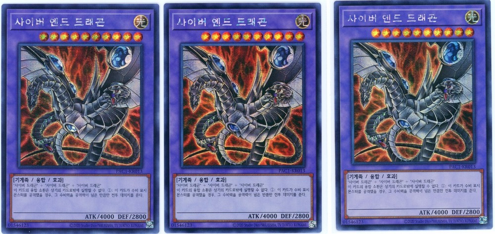This lot includes (3) three separate copies of Cyber End Dragon PAC1-KR013 Secret Rare Alternate Art (B) The card is pack fresh and was immediately put into a sleeve and top loader. For shipping: cards will be placed in a Card Saver 1, put into a team bag with a piece of cardboard for added stability, then inserted into a double envelope. I will tape all of the edges of the envelope to prevent ripping and water damage. I use USPS eBay Trading Card shipping with a tracking number that will be provided to you through eBay.